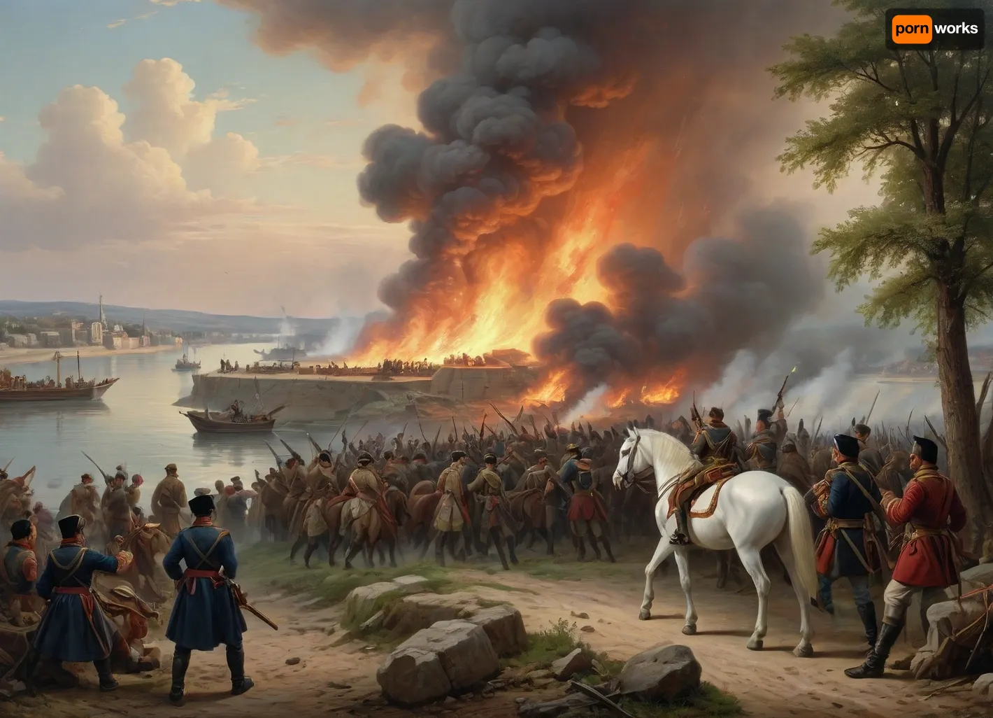 masterpiece, full color image, 8K quality, oil painting by a Russian artist, The painting depicts the very moment of the beginning of the storming of the fortress in the early morning. On the right, in the foreground, there is a cannon, from which Russian gunners fire a signal shot to attack. A.V. Suvorov is shown on the left, sitting on his white horse Mishka, and M.I. Kutuzov is on his right hand. Next to them are Russian soldiers and officers storming the bastions and walls of the burning Turkish fortress of Izmail. On the right side of the painting is the Danube River, where you can see the outlines of the boats of the landing troops. masterpiece, full color image, 8K quality, oil painting by a Russian artist, The painting depicts the very moment of the beginning of the storming of the fortress in the early morning. On the right, in the foreground, there is a cannon, from which Russian gunners fire a signal shot to attack. A.V. Suvorov is shown on the left, sitting on his white horse Mishka, and M.I. Kutuzov is on his right hand. Next to them are Russian soldiers and officers storming the bastions and walls of the burning Turkish fortress of Izmail. On the right side of the painting is the Danube River, where you can see the outlines of the boats of the landing troops.