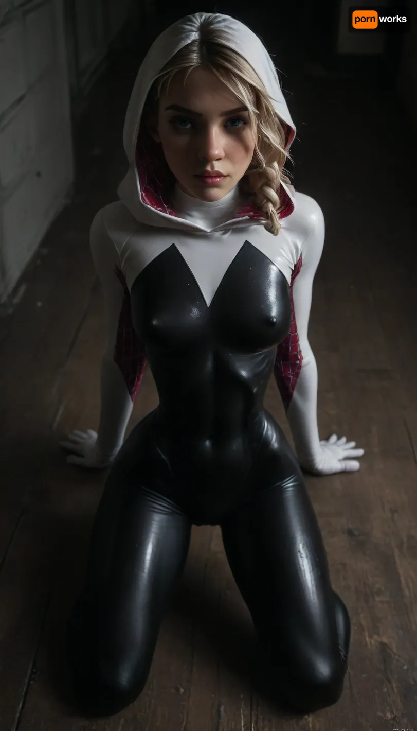(((18 years old))), (((young))), (spider girl Gwen Stacy), Braided side Side Cornrows white Hair, (seductive shy face), ((tight outfit)), (athletic body:1.5), (athletic abs and legs), (hip gap:1.3), ((wide hips)), (narrow waist:1.7), (white hair), (view from front:1.6), view from above, (overhead view:1.4), ((leaning forward)), ((sitting on all fours on the floor)), (makeup), ((pussy cameltoe:1.4)), (wet clothes), (makeup:1.4), (oiled skin:1.7), (wet tight bodysuit:1.8), very tight suit, hand, 1girl, (athletic ass), (high detailed face:1.5), dim lights, (hard nipples:1.3), (big perky boobs:1.4), big breast, (chiaroscuro lighting:.3), <lora:HandFineTuning_XL:1>, <lora:MGLRbodysuit_sdxl:.6>, <lora:uberfit_lora_sdxl:.4>, <lora:dark:.3>, <lora:M0llY_PARK3R-000001:.8> (((18 years old))), (((young))), (spider girl Gwen Stacy), Braided side Side Cornrows white Hair, (seductive shy face), ((tight outfit)), (athletic body:1.5), (athletic abs and legs), (hip gap:1.3), ((wide hips)), (narrow waist:1.7), (white hair), (view from front:1.6), view from above, (overhead view:1.4), ((leaning forward)), ((sitting on all fours on the floor)), (makeup), ((pussy cameltoe:1.4)), (wet clothes), (makeup:1.4), (oiled skin:1.7), (wet tight bodysuit:1.8), very tight suit, hand, 1girl, (athletic ass), (high detailed face:1.5), dim lights, (hard nipples:1.3), (big perky boobs:1.4), big breast, (chiaroscuro lighting:.3), <lora:HandFineTuning_XL:1>, <lora:MGLRbodysuit_sdxl:.6>, <lora:uberfit_lora_sdxl:.4>, <lora:dark:.3>, <lora:M0llY_PARK3R-000001:.8>
