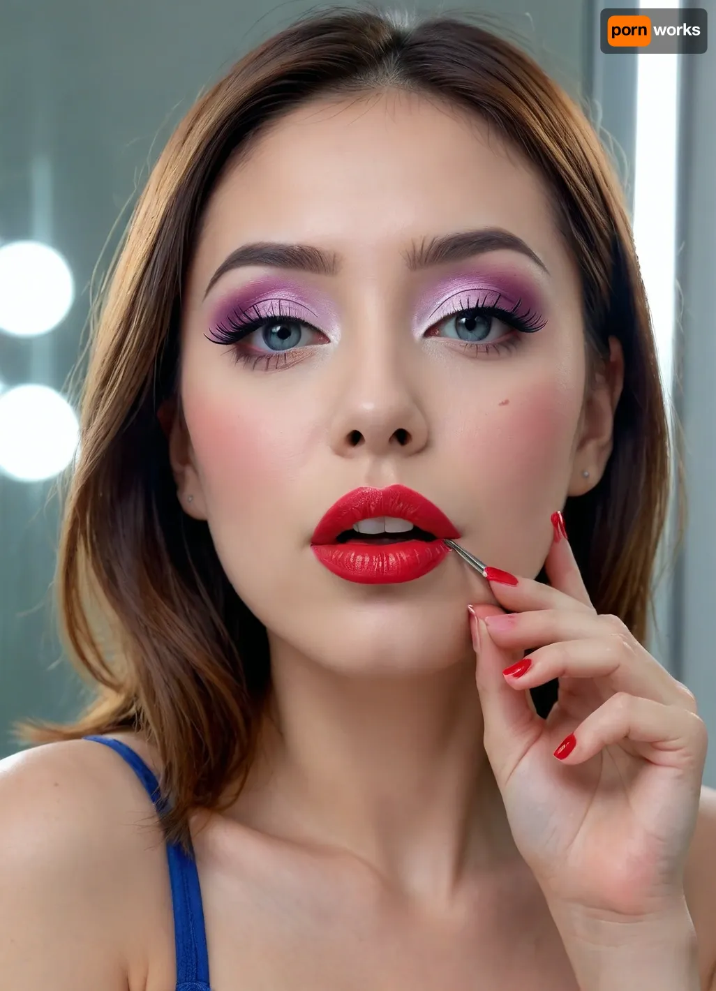 The image shows a yo girl Japanese wearing a sleeveless gray dress with decorative details on the shoulders., (bright lighting:1.2), beautiful detailed eyes, extremely detailed face, perfect lighting, best quality, steel pipe indide pussy, solo, ((anus)), She has long, wavy brown hair and is smiling while applying red lipstick. She holds a red lipstick in one hand and a compact mirror in the other, which is partially open. Red sunglasses rest on top of her head, and she has pinky-red nail polish, matching her lipstick. The background is plain and light-colored, emphasizing her as the focal point., CUM, DONATION, ASSISTANCE, FELLATIO, TITS, SEX, HANDJOB, FOOTJOB, AFTER, VAGINAL, Jungle, w4t3rf4ll, ((makeup:1.5), long blue eyelashes with eyeliner:1.2), (big lips:1.3), (purple pussy:1.1), <lora:CUM DONATION ASSISTANCE:1.4>, <lora:Jungle_w4t3rf4ll:.8>
