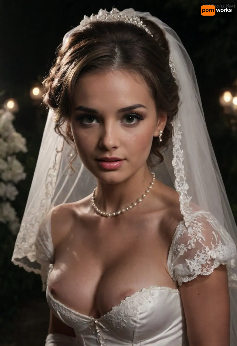 high resolution, high quality, dark scene at night, closeup of face, cute woman, smile, pearl choker, pearl earrings, (brunette Hair in elaborate updo:1.4), (standing model posing, (wedding dress:1.2), (white corset:1.2), (wedding veil:1.3), (white lace gloves), nipslip, thick eyebrows, very cute, smile, out of focus colorful flowers in a romantic outdoor background, outdoors, on, face, bukkake, cum), bellissima, downblouse, nipslip, d3v0n, 1woman, <lora:LesFemmesXL_v1.0:1.5>, <lora:dark:.4>, <lora:RealDownblouseXL2:.9>, <lora:Devon:1.4>