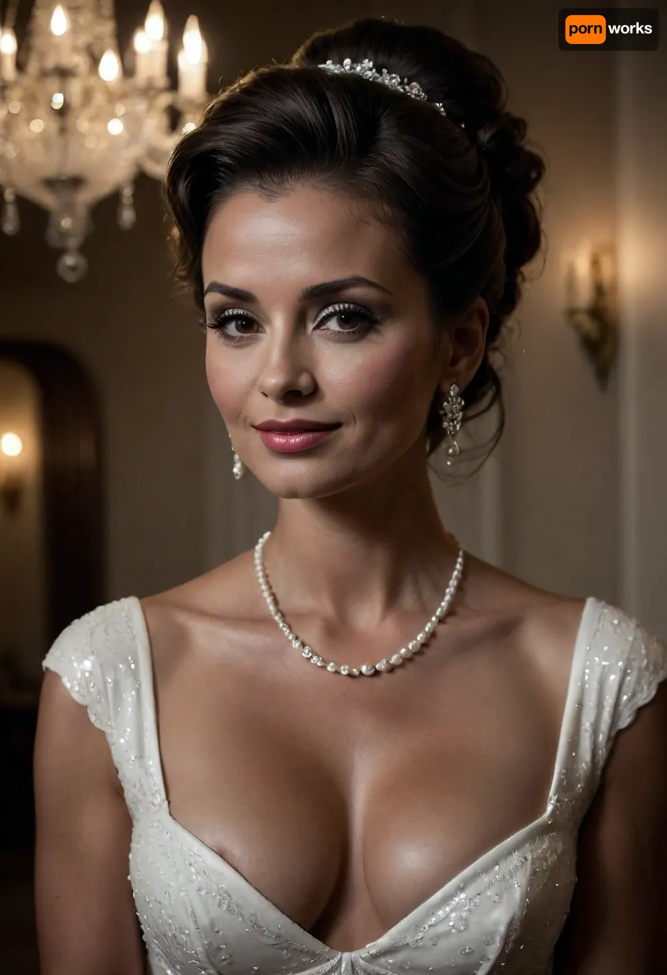 high resolution, high quality, dark scene at night, closeup of face, elegant middle aged woman, seductive smile, large pearl choker around neck, long pearl necklace down cleavage, large pearl earrings, pierced nipples, (brunette Hair in elaborate updo:1.4), (standing model posing, (wedding dress:1.2), (white wedding dress:1.2), white sequined dress:1.5), nipslip, nipple edges are visible, (wedding veil:1.3), (white lace gloves), very cute, out of focus colorful flowers in a romantic indoor background, indoors, holding flowers, bellissima, clothes, downblouse, cr1st4n1c0l3, <lora:LesFemmesXL_v1.0:1.5>, <lora:dark:.4>, <lora:RealDownblouseXL2:1>, <lora:Crista_Nicole:1.3> high resolution, high quality, dark scene at night, closeup of face, elegant middle aged woman, seductive smile, large pearl choker around neck, long pearl necklace down cleavage, large pearl earrings, pierced nipples, (brunette Hair in elaborate updo:1.4), (standing model posing, (wedding dress:1.2), (white wedding dress:1.2), white sequined dress:1.5), nipslip, nipple edges are visible, (wedding veil:1.3), (white lace gloves), very cute, out of focus colorful flowers in a romantic indoor background, indoors, holding flowers, bellissima, clothes, downblouse, cr1st4n1c0l3, <lora:LesFemmesXL_v1.0:1.5>, <lora:dark:.4>, <lora:RealDownblouseXL2:1>, <lora:Crista_Nicole:1.3>