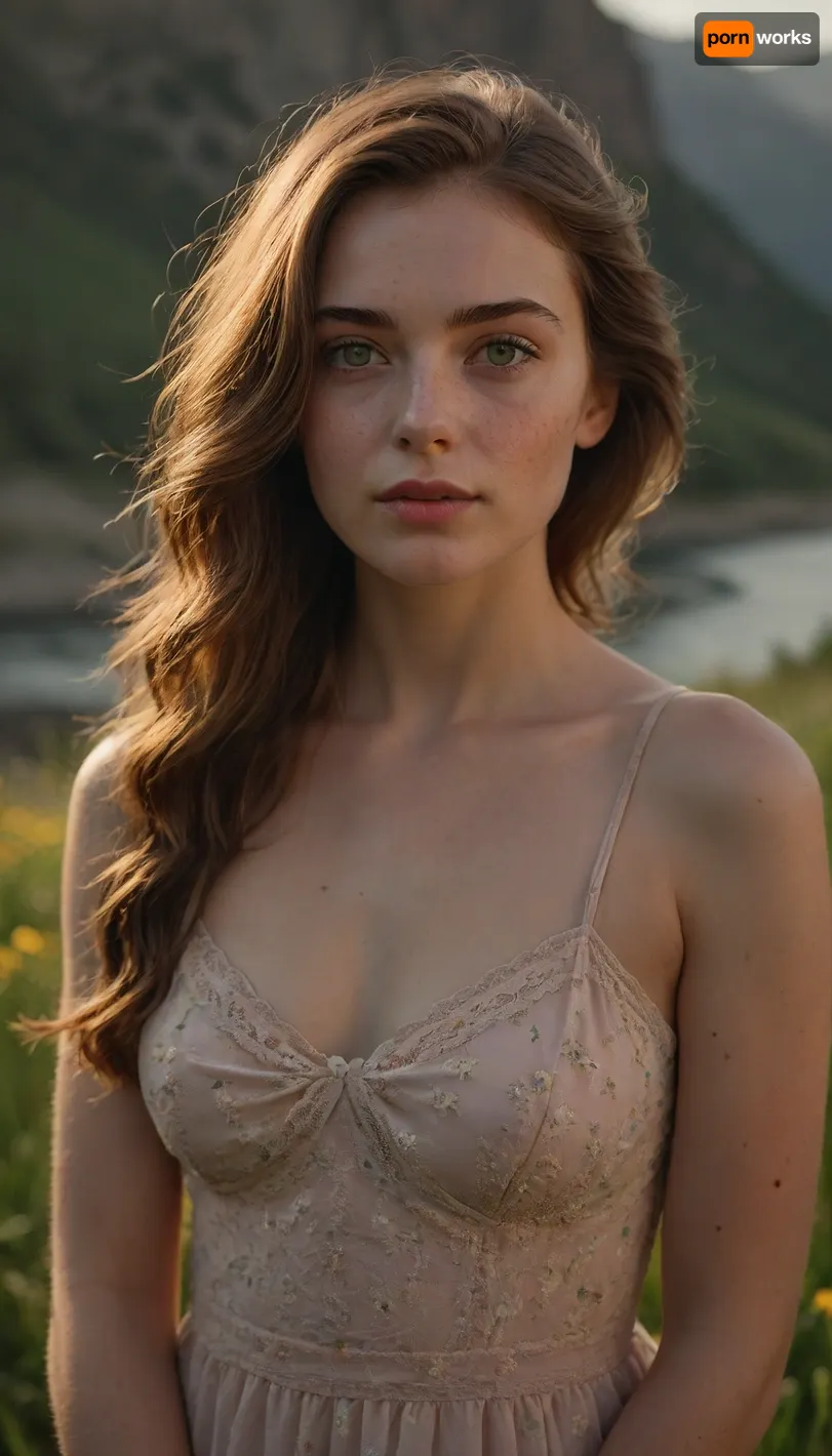 Ultra-realistic portrait of a young woman with soft, sun-kissed skin and natural freckles, gazing gently at the viewer. She has deep green eyes, well-defined eyebrows, and subtle, warm-toned makeup. Her long, wavy brown hair flows naturally over her shoulders, with a delicate pink daisy tucked behind her ear. She wears a dark, floral-patterned summer dress with thin straps, revealing her sunlit shoulders. The background showcases a stunning golden-hour mountain landscape with a serene river, lush greenery, and yellow wildflowers. The setting sun casts a warm, soft glow, enhancing the dreamy and tranquil atmosphere. The composition is balanced with a slightly blurred background, focusing on the subject's serene and natural beauty.