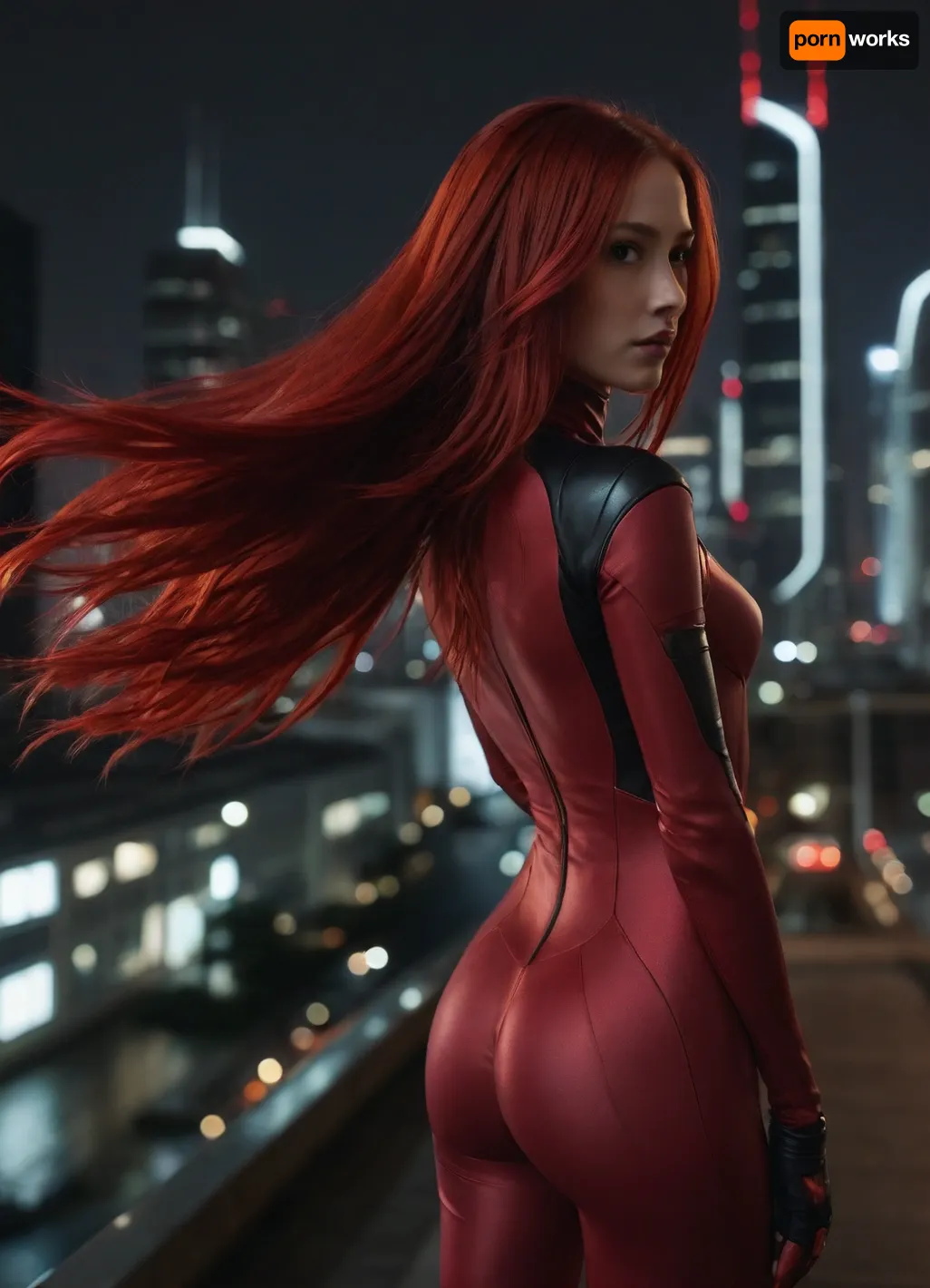 long red flying hairs, dark red plugsuit, black patches, facing camera, at night, background is futuristic city