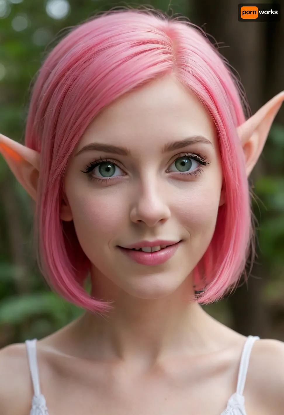 Petite skinny elf with a very cute face snub-nosed nose detailed beautiful green eyes hairstyle curvy bob short bob bright pink saturated hair looks at the camera and smiles fervently smiles at the fact that her face is completely covered with thick white sperm completely covers her face cute cute elf girls high detail high definition images model hairstyle head hair styling