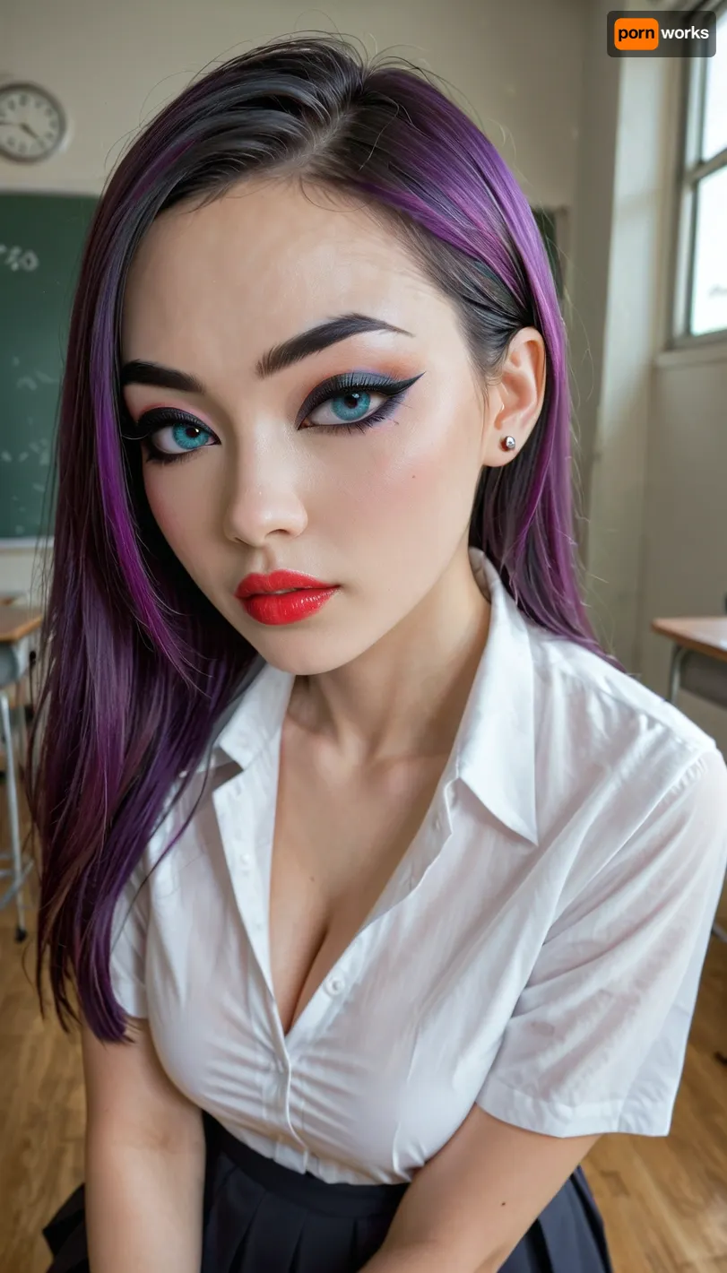 beautiful, 22 years old, (cute asian face), (school girl:1.5), school uniform only mini skirt, seducive look, in classroom, looking into camera, big asian eyes, shaved, extra long hair, (blue eyes), (purple hair), (perfect tits), (eyeliner:1.8), red, eyes, perfecteyes, <lora:add-detail-xl:1>, <lora:PerfectEyesXL:1> beautiful, 22 years old, (cute asian face), (school girl:1.5), school uniform only mini skirt, seducive look, in classroom, looking into camera, big asian eyes, shaved, extra long hair, (blue eyes), (purple hair), (perfect tits), (eyeliner:1.8), red, eyes, perfecteyes, <lora:add-detail-xl:1>, <lora:PerfectEyesXL:1>