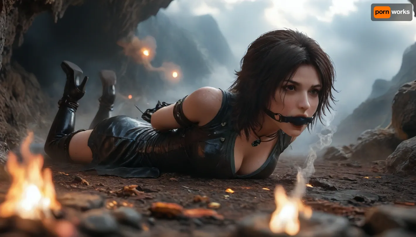 Tomb Raider laying behind a large campfire in front of the cave dwelling, random facial emotions, (highly detailed clothes:1.6), leather miniskirt, leather boots with high heels, beigeb uckskin dress, big brown eyes, (medium natural breasts:1.2), prone with arms restrained behind her back, cleavage, upskirt, ball gagged, (very sweaty), cloudy, smoke, atmospheric, clouds, fog, Black, and, white, art, black, shading, charcoal, darkness, toned, brutal, dark, b/w, color, scheme, <lora:add-detail-xl:2>, <lora:MJ52:1.9>, <lora:Cloudy_Style:2>, <lora:Hell_Constantine_2005_-_Anime:.3>, <lora:Black and white art.V1:2>, top view, side view