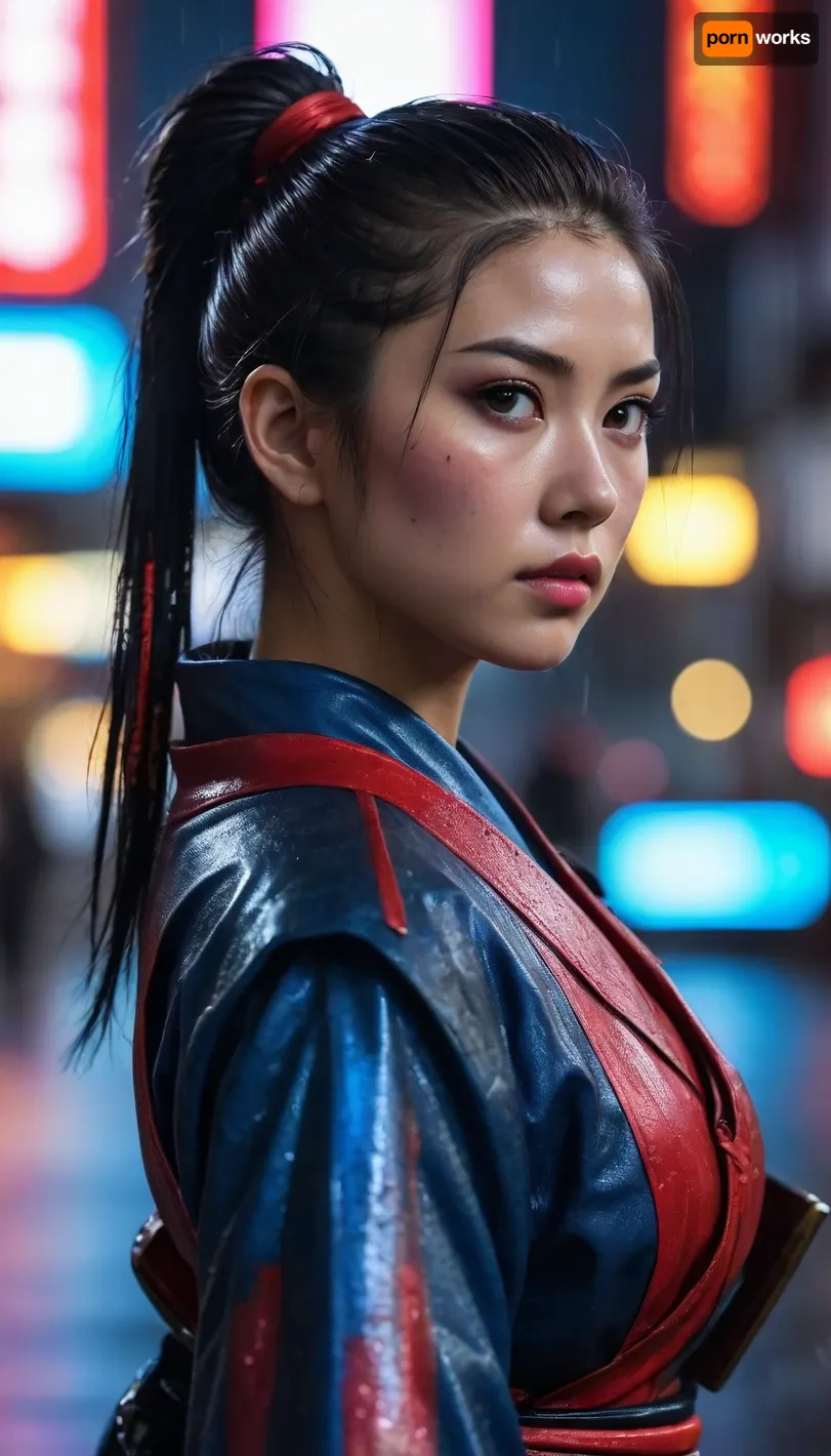 A young female samurai standing in a neon-lit rainy city street at night, looking back over her shoulder with a calm yet determined expression, black hair tied in a ponytail slightly wet from the rain, wearing detailed red and blue samurai armor that reflects the glow of neon lights, holding a sheathed katana angled down at her side, cinematic lighting, hyper-realistic digital art, cyberpunk mixed with traditional Japanese aesthetic, blurred neon signs in red blue and orange reflecting on wet pavement, dark moody atmosphere, portrait close-up focused on upper body, painterly cinematic style. A young female samurai standing in a neon-lit rainy city street at night, looking back over her shoulder with a calm yet determined expression, black hair tied in a ponytail slightly wet from the rain, wearing detailed red and blue samurai armor that reflects the glow of neon lights, holding a sheathed katana angled down at her side, cinematic lighting, hyper-realistic digital art, cyberpunk mixed with traditional Japanese aesthetic, blurred neon signs in red blue and orange reflecting on wet pavement, dark moody atmosphere, portrait close-up focused on upper body, painterly cinematic style.
