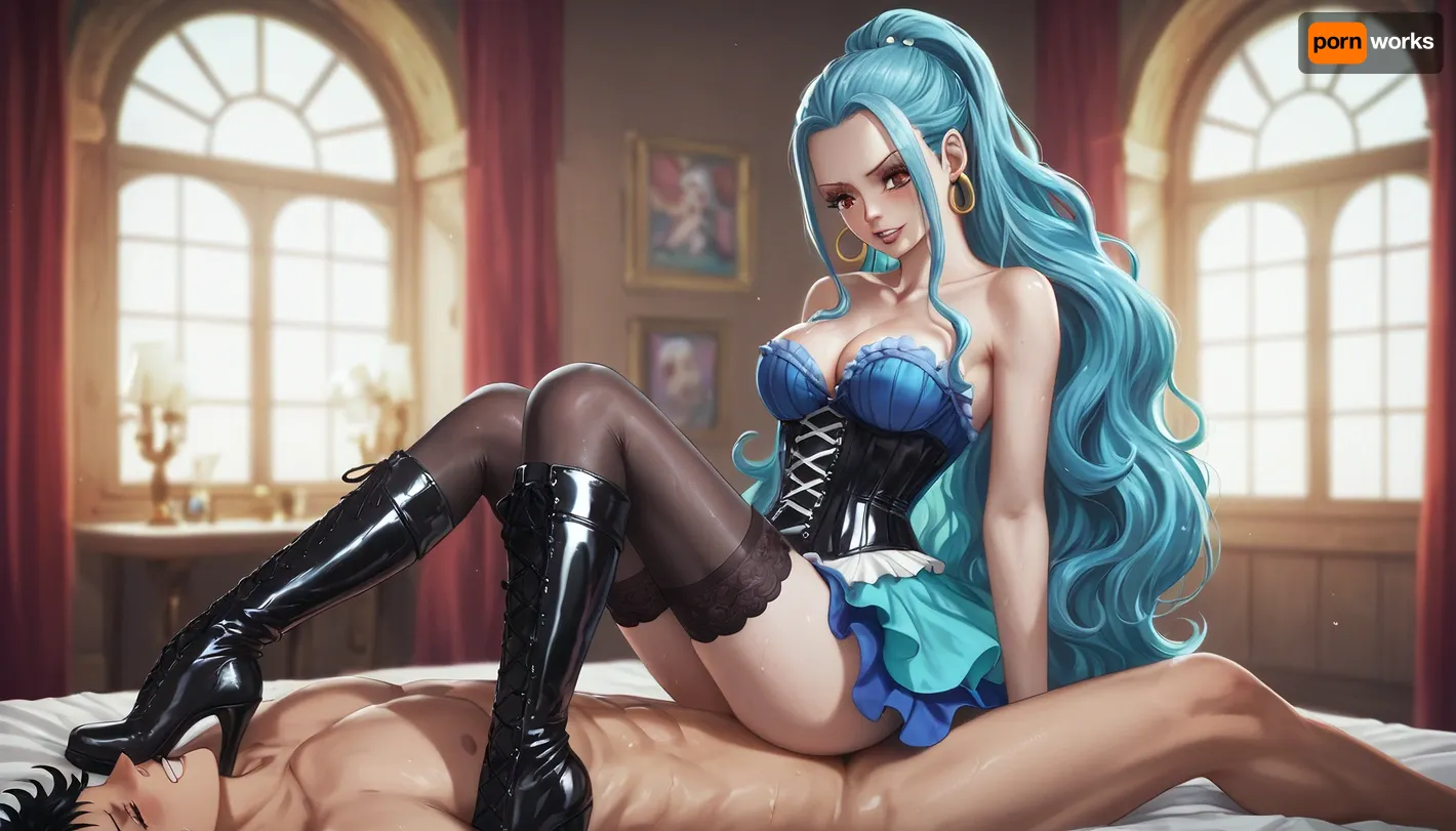 Nefertari Vivi from one piece, stockings, knee high boots corset, cleavage, sitting cowgirl sex