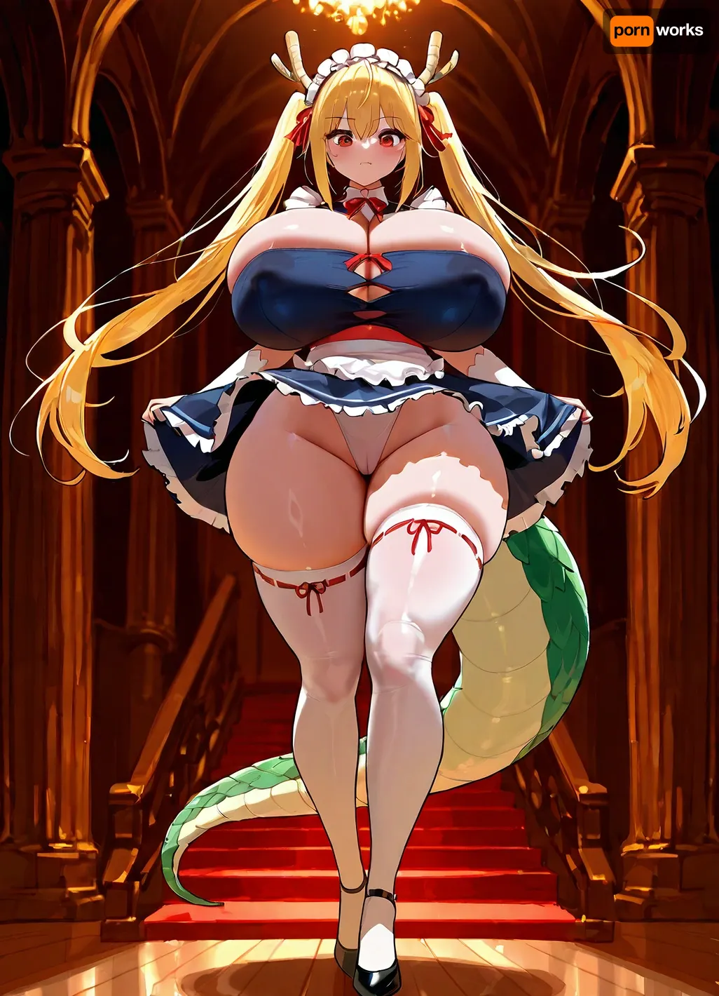 Tohru dragon maid. Venus body, hyper boobs, huge cleavage, maid outfit, tight clothes, covered nipples, large areolas, green dragon tail. Full body view., nicorima, flat, chest, gigantic, small, hips, thighs, wide, thick, plump, belly, muscular, female, arms, extra, abs, large, breasts, big, boobs, huge, tits, <lora:Nicorima Style:.8>, <lora:Venus_Body_Alpha:.8>, <lora:bombshell_v2:.8>