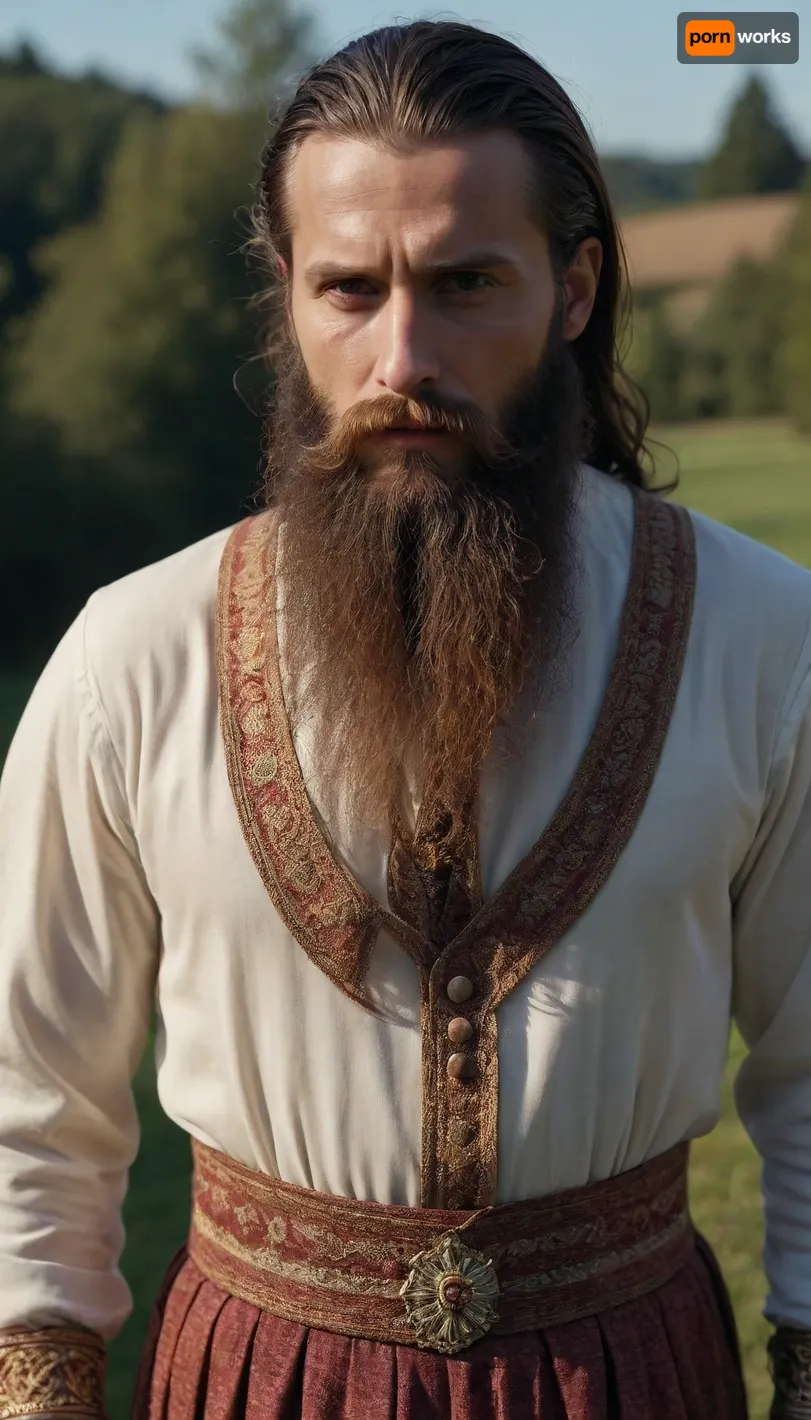 (2/3 sideview, far from a wide distance), wide angle, high quality textures, photorealistic, high resolution photograph, 8k details, score_9, score_8_up, score_7_up, sharp focus, masterpiece, perfect eyes, highest quality, ultra-detailed images, fine details, high resolution, 8k, hyperrealism, hard shadows, a A mixture of Baden, Westphalian, and Swiss, male, long full beard, man, full body view, dress
