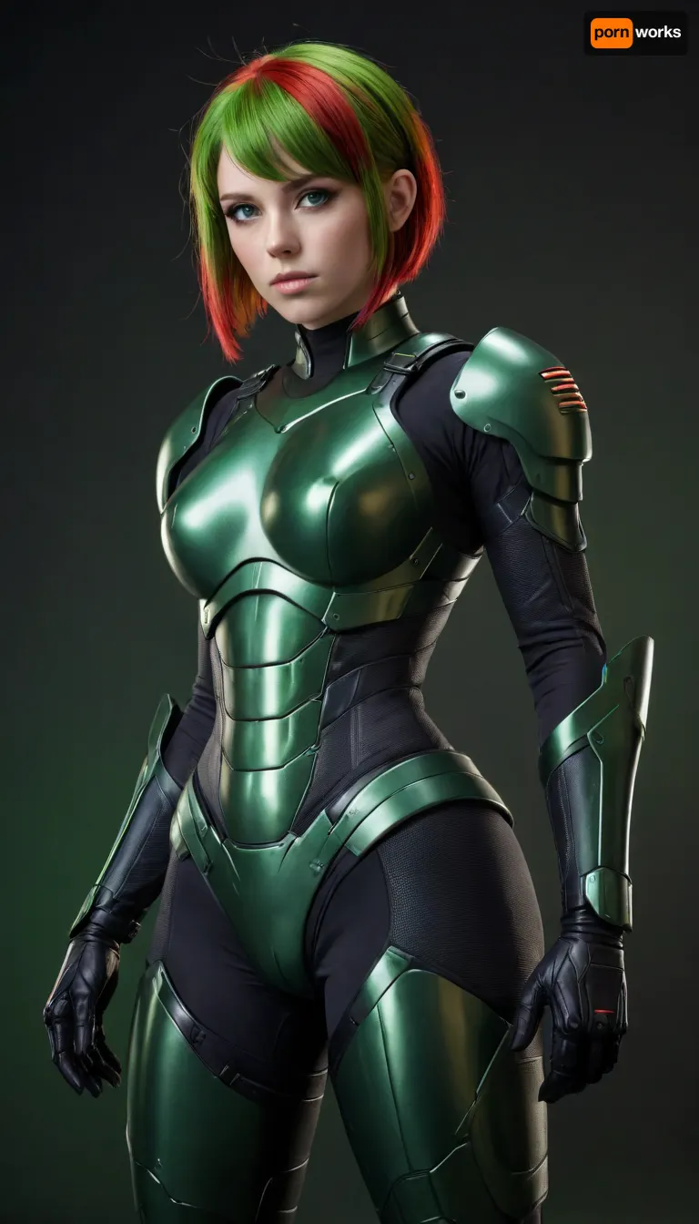 head to toe image of an android girl full dark green plastic full body armor with green and red hair in a long pixie cut hair seen from the 3/4 side, luminescent Bright Green eyes, all black background, d-cups, <lora:220437_training_data:.5>, <lora:Venus_Body_Alpha:.5> head to toe image of an android girl full dark green plastic full body armor with green and red hair in a long pixie cut hair seen from the 3/4 side, luminescent Bright Green eyes, all black background, d-cups, <lora:220437_training_data:.5>, <lora:Venus_Body_Alpha:.5>