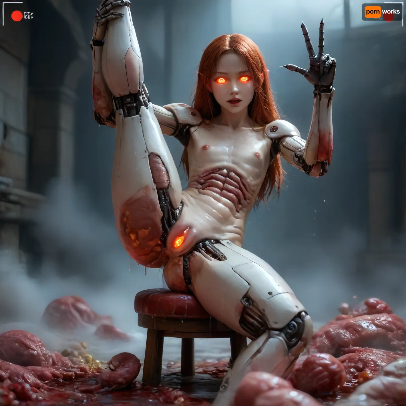 high quality, incredible detail, perfect lighting 1.2, 1 sexy nude anorexic ginger Irish woman, (transforming into a sexy realistic skinny, evil anthropoid succubus girl, split forked tongue dripping, big puffy wet open pussy. they are playing with there erect nipples. sharp teeth futanari. bukkake., (night:1.3), (((mystical fog, white transparent slime liquid wets meat and skin. skinned animals.))), human skulls, skull, high contrast, ((((glowing red eyes. standing splits on pile of fleshy white meat squids and bloody raw meat, entrails, savagely feasting on raw organs, brains, pussy swollen in view finder, (highly detailed face:1.3), (flat chested:1.3))))), neon, lights, dark, ambient, light, (evil eyes:1.3), (long pointed elf ears:1.2), spread legs, (bed:1.3), (realistic dragon claws on her fingernails:1.3), (intense dragon vagina texture)), ((((15 tons of aloe Vera liquid covers the entire scene)))), searching meat pile for sex toys, Photo realistic erotic photo, professional erotic artistic photography, highest-resolution, 32k uhd, hdr, 120mm film photo, breathtaking gorgeous goth anorexic, (skinny anorexic body:1.3), (sadistic slut attitude:1), sexy poses photo realistic skin details, freckles, pimples, dimples, acne, (random view and random angle:1.5), ac_neg1, 4ng3l, face, <lora:SDXL_BetterFaces-LoRA_v1:1>, ((perfect fingers, perfect hands, perfect skin)), tows, ropes, ((pussy visibles, big clitoris visibles, HDR pussy, squat, hyper pussy juice dripping)), (flat chested body proportions), holding breasts, view from side, ((realistic, uhd, highly detailed, 8k)), but, ForniteStyle, <lora:OWStyleYeiyeiArt-8:1.4>, character is woman, full body in frame, face in frame, focus on pussy, ((creampie)), show one middle finger to viewer, one finger, show finger, gives middle finger, (fuck off gesture), (((middle))), Cyberpunk, very wet, commanding, fetish, wet body, dystopian sci-fi future setting, bioluminescent, 8k wallpaper, beautiful face, (skin pores 1.3), [pink, purple], hair, sexual pose, ((robotic cyborg skin), , :1.6), (robotic arms), dark lip gloss, (cyborg:1.7), (robotic legs), full body, sitting on stool, legs spread, legs open, dripping pussy, (huge clit:1.9), hi-detailed pussy, perfect pussy, creepy dark fantasy, (boobs:1.4), exotic hairstyle, ((glowing eyes), , :1.8), (glowing fluids, wet body:1.4)