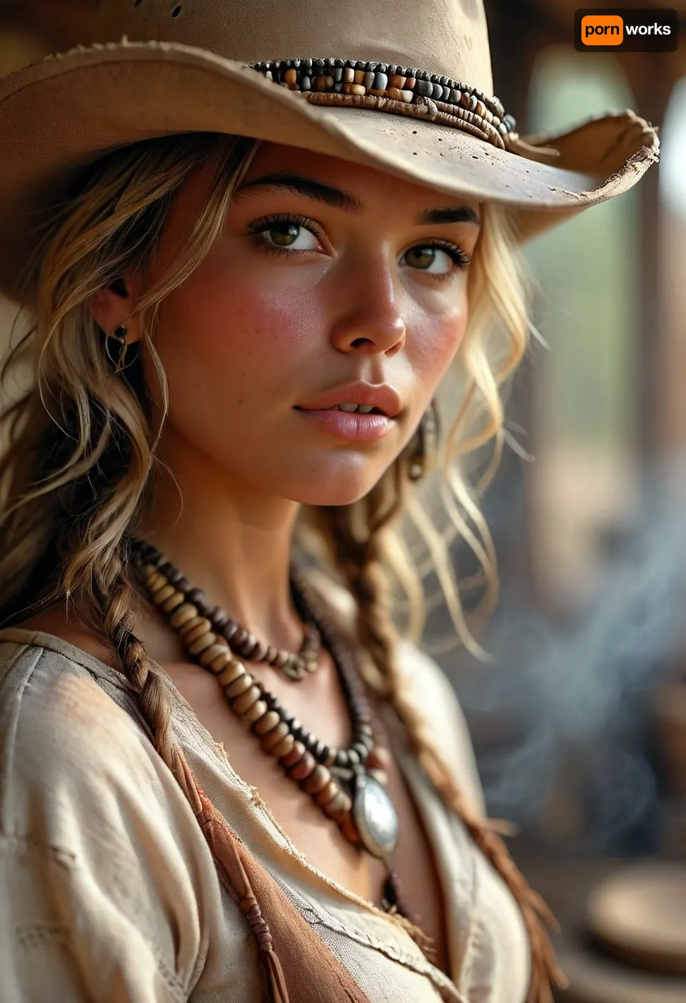 Photorealistic Wild West scene, intimate but calm moment between two women, medium close-up including upper bodies, cinematic natural lighting, shallow depth of field. A blonde, sun-kissed revolver heroine and a dark skinned Indigenous American woman face each other in quiet connection, visible cozy fingertip strokes as she gently touches across her friend’s skin. The revolver heroine has light skin, sun-tanned, eyes softly closed, trusting and peaceful expression. She wears a weathered cowboy hat, a loosely tied neckerchief, a rough linen shirt with a few buttons open, and a worn vest, classic frontier clothing with realistic fabric texture. Her posture is relaxed and open. Opposite her stands the Indigenous woman with dark, rich skin tones, calm focused gaze. She wears a traditional headdress made of natural beads of varying sizes, real pearls, feathers, and a necklace crafted from bone beads, shells, and natural materials. Every element feels handcrafted and authentic. The background is softly blurred, revealing tipis and the quiet life of a Native American village. Warm earth tones, gentle wind, dust in the air. The entire image radiates stillness, respect, and cultural contrast. Ultra-high resolution, photorealism, realistic skin pores, flawless hands and fingers, natural color grading, no modern elements, Ensure no flaws in the hands and fingers, and create a scene full of authenticity and connection, (maximum detail), (super realistic photo:1.4), cloudy, smoke, atmospheric, clouds, fog, <lora:MJ52:.6>, <lora:Super_Eye_Detailer_By_Stable_Yogi_SDPD0:.3>, <lora:BUT_SDXL_SHS:.3>, <lora:Sweaty_Realism_4-000006:.8>, <lora:Cloudy_Style:.8> Photorealistic Wild West scene, intimate but calm moment between two women, medium close-up including upper bodies, cinematic natural lighting, shallow depth of field. A blonde, sun-kissed revolver heroine and a dark skinned Indigenous American woman face each other in quiet connection, visible cozy fingertip strokes as she gently touches across her friend’s skin. The revolver heroine has light skin, sun-tanned, eyes softly closed, trusting and peaceful expression. She wears a weathered cowboy hat, a loosely tied neckerchief, a rough linen shirt with a few buttons open, and a worn vest, classic frontier clothing with realistic fabric texture. Her posture is relaxed and open. Opposite her stands the Indigenous woman with dark, rich skin tones, calm focused gaze. She wears a traditional headdress made of natural beads of varying sizes, real pearls, feathers, and a necklace crafted from bone beads, shells, and natural materials. Every element feels handcrafted and authentic. The background is softly blurred, revealing tipis and the quiet life of a Native American village. Warm earth tones, gentle wind, dust in the air. The entire image radiates stillness, respect, and cultural contrast. Ultra-high resolution, photorealism, realistic skin pores, flawless hands and fingers, natural color grading, no modern elements, Ensure no flaws in the hands and fingers, and create a scene full of authenticity and connection, (maximum detail), (super realistic photo:1.4), cloudy, smoke, atmospheric, clouds, fog, <lora:MJ52:.6>, <lora:Super_Eye_Detailer_By_Stable_Yogi_SDPD0:.3>, <lora:BUT_SDXL_SHS:.3>, <lora:Sweaty_Realism_4-000006:.8>, <lora:Cloudy_Style:.8>