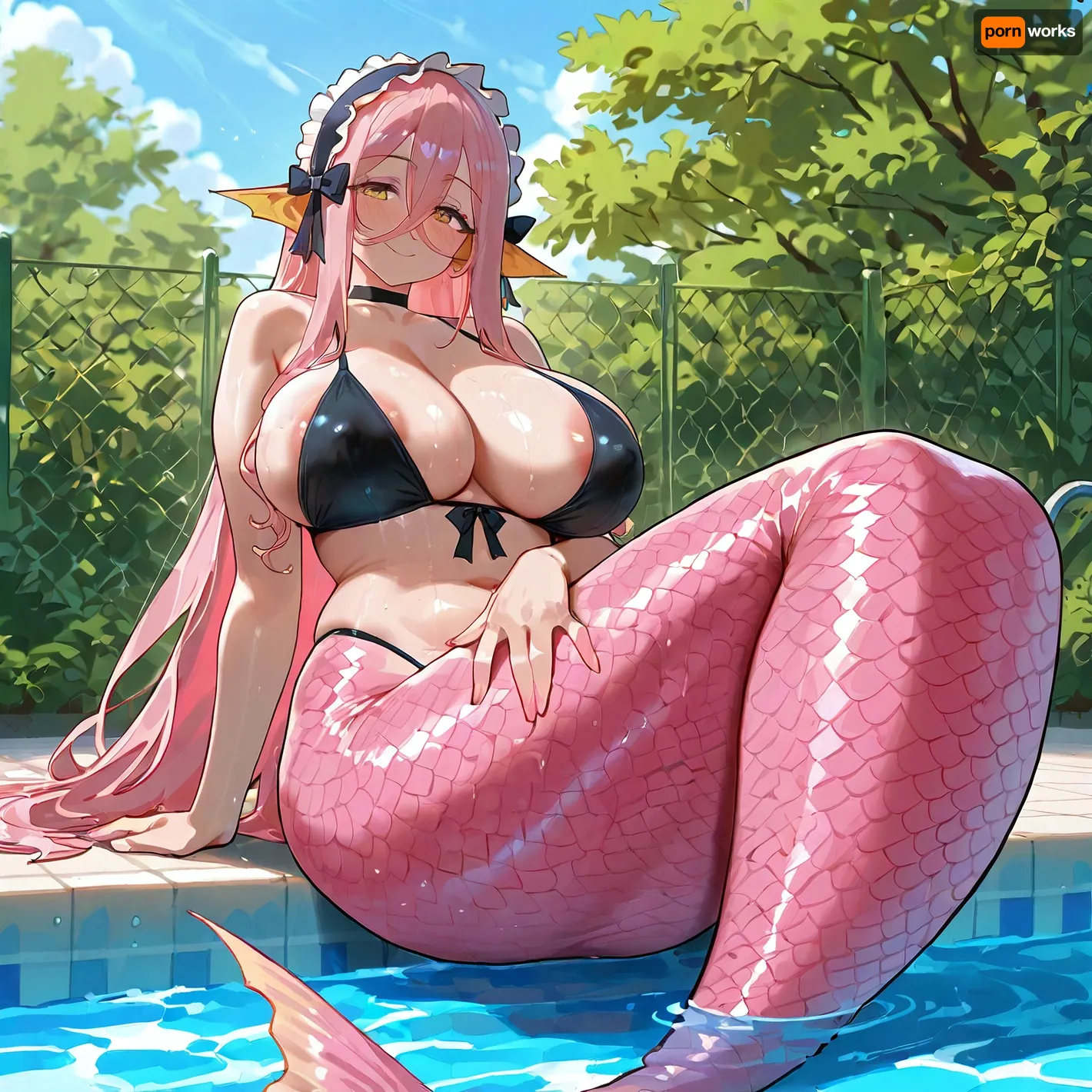 Meroune Lorelei, (Monster Musume), . Mermaid monster girl sitting in swimming pool, black bikini, large cleavage, pink hair, pink mermaid tail, large areola, covering pussy with one hand. Small smile, blushing, backyard swimming pool, soft lighting, sunny day.