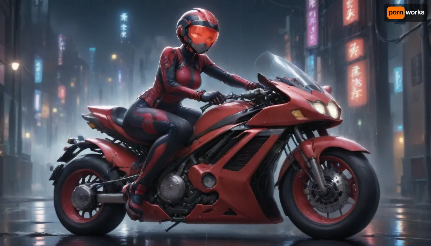 woman sitting on a motorcycle, suzuki, sports, black motorcycle, helmet, closed visor, from the front, lights on, red leather clothes, night, big city, rain