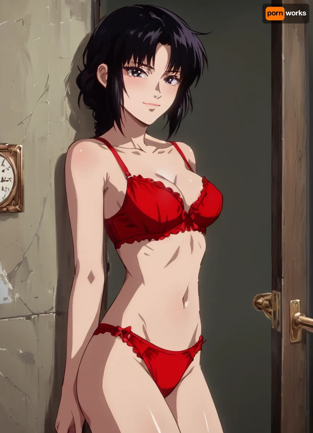 Black hair, braid, medium breasts, cute, 18 years old, cute and sexy pose, naked, skinny, entrance hall in the apartment, red sexy lingerie, seductive smirk, leaned against the wall by shoulder, bare legs, <lora:NEOTOKIOXL_0.2_RC:1.4> Black hair, braid, medium breasts, cute, 18 years old, cute and sexy pose, naked, skinny, entrance hall in the apartment, red sexy lingerie, seductive smirk, leaned against the wall by shoulder, bare legs, <lora:NEOTOKIOXL_0.2_RC:1.4>