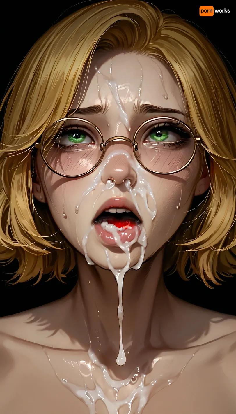1girl, Sweat girl, pretty girl, green eyes, black bangs, round glasses, excessive facial, cum dripping from nose, shaking orgasm, choking, shaved pussy, ratatatat74, <lora:ratatatat74-000050:1.7>, <lora:ishikeiXL:.9>