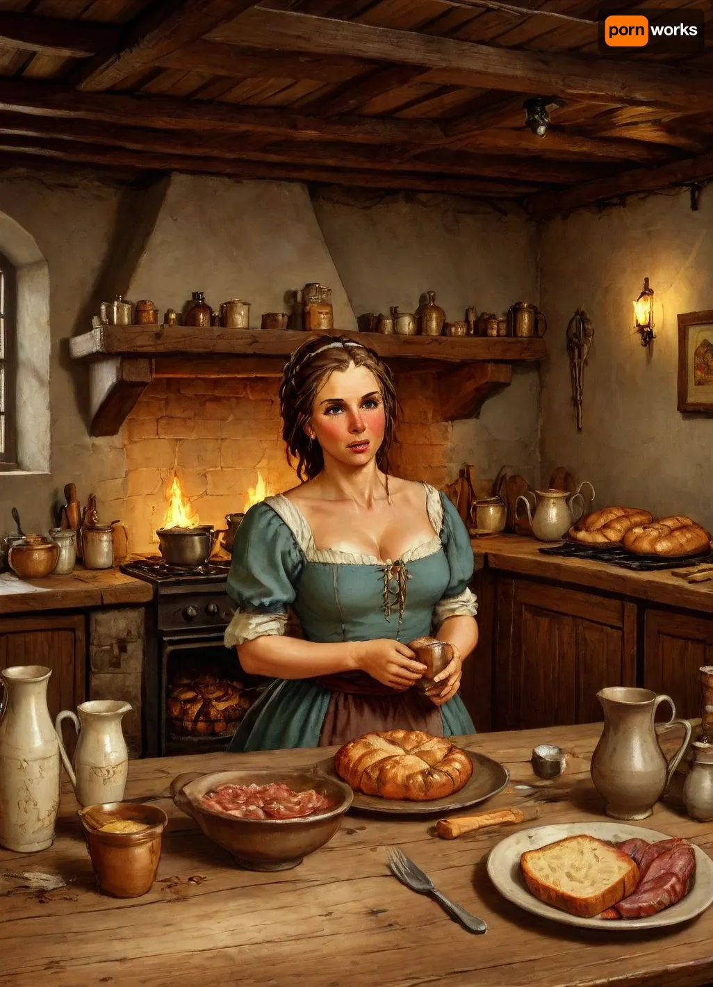 There are clay mugs and plates on the table only, There are no glassware anywhere, just crudely made clay mugs and clay bowls., (8k uhd, dslr, highest quality, masterpiece, detailed skin texture, (highly detailed hair), (highly detailed face), extremely detailed), 1woman, milf 40 year old, curvy, chubby, Medieval A commoner woman drinks beer from a clay mug at a wooden table in a cozy, dimly lit tavern. She has a a large bust, is short and a bit plump, dressed in a medieval simple, modest women's clothing. The woman wears simple cheap beads, and her hair is styled in a beautiful, traditional medieval updo. she undressing at the table, The tavern is rustic with stone walls, wooden beams on the ceiling, and warm, flickering candlelight casting soft shadows on the room. The table is covered with various medieval dishes, including bread, roasted meat, and mugs of ale. The atmosphere is intimate and inviting, with a fire crackling in the hearth, adding a warm glow to the room., Sketch, Painting, <lora:Dusk_XL_Rockwell_dadapt_cos_1e-7:.8>, <lora:Drawings_Pierre_Joubert_Style:.5> There are clay mugs and plates on the table only, There are no glassware anywhere, just crudely made clay mugs and clay bowls., (8k uhd, dslr, highest quality, masterpiece, detailed skin texture, (highly detailed hair), (highly detailed face), extremely detailed), 1woman, milf 40 year old, curvy, chubby, Medieval A commoner woman drinks beer from a clay mug at a wooden table in a cozy, dimly lit tavern. She has a a large bust, is short and a bit plump, dressed in a medieval simple, modest women's clothing. The woman wears simple cheap beads, and her hair is styled in a beautiful, traditional medieval updo. she undressing at the table, The tavern is rustic with stone walls, wooden beams on the ceiling, and warm, flickering candlelight casting soft shadows on the room. The table is covered with various medieval dishes, including bread, roasted meat, and mugs of ale. The atmosphere is intimate and inviting, with a fire crackling in the hearth, adding a warm glow to the room., Sketch, Painting, <lora:Dusk_XL_Rockwell_dadapt_cos_1e-7:.8>, <lora:Drawings_Pierre_Joubert_Style:.5>