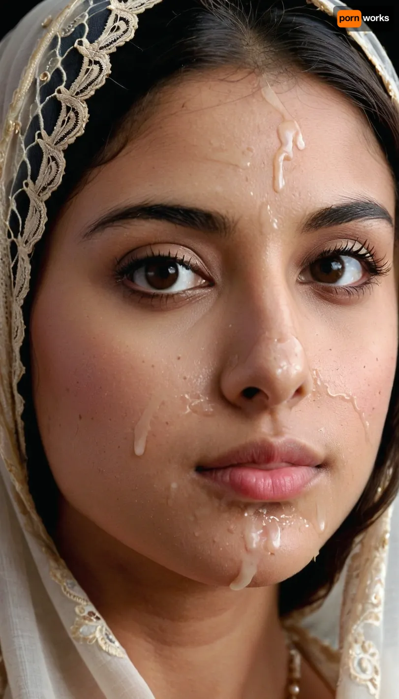 Close-up portrait of a, (very petite:1.3), (19 year old), (arabic woman), (lace-hijab), (lace-bra), (cum on face), (cum on hijab), . woman, cum, on, face, <lora:JustCum:.8>