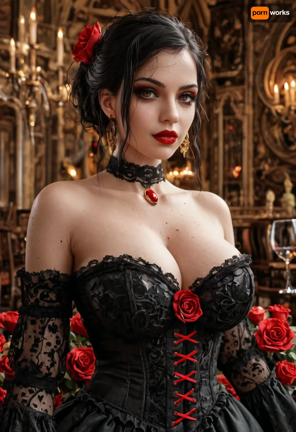 Gothic wine tasting, a stunning gothic woman, deep smoky eyes, bold red lips, and piercing gaze, long voluminous black hair in an elegant updo adorned with deep red roses, wearing a black lace corset with gold accents, off-shoulder sheer lace sleeves, and an intricate gothic choker with red gemstone pendants, showing cleavage of large breasts Gothic wine tasting, a stunning gothic woman, deep smoky eyes, bold red lips, and piercing gaze, long voluminous black hair in an elegant updo adorned with deep red roses, wearing a black lace corset with gold accents, off-shoulder sheer lace sleeves, and an intricate gothic choker with red gemstone pendants, showing cleavage of large breasts