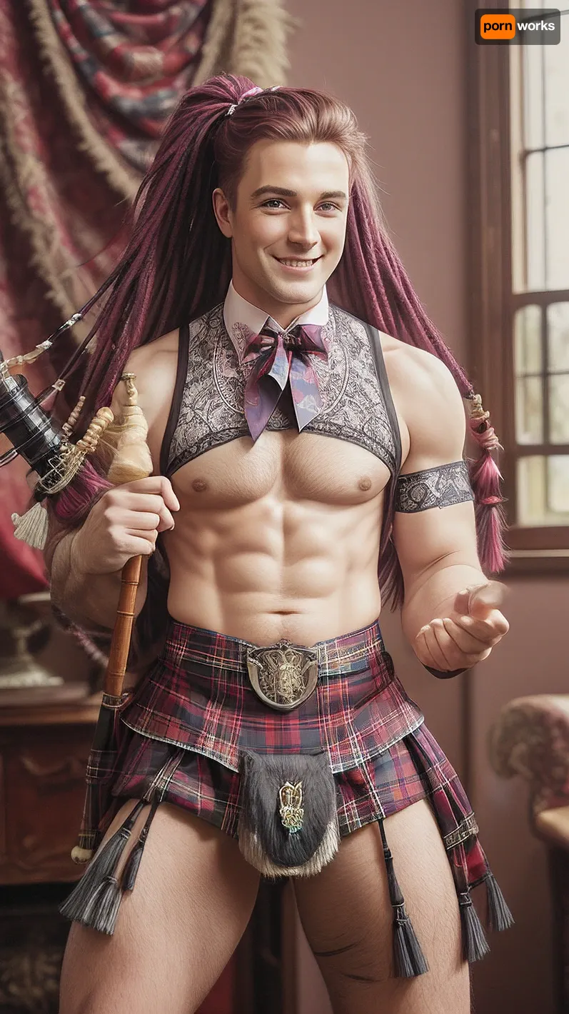 Male Scottish MAN, of the male sex, full body image, penis and big balls tugged in mauve silky briefs, lace panties, plaidcorset, Scottish patterns clothing, LONG colored dreadlocks in two pony tails, holding bagpipe instrument, HE is standing in a large open space, is dressed as an Scottish girl, corsetterie, stockings, traditional Scottish culture clothing CLASH with modern design garter belt and stockings, showing off blue satin corset with Russian patterns embroided, HE is wearing hot lingerie, deep red panties, pink Scottish clan plaid, leather bands, crimson satin ribbons in hair, HE is blushing, he is smiling, 75% male jaw line, shaven face, sixpack, NO visible PENIS Male Scottish MAN, of the male sex, full body image, penis and big balls tugged in mauve silky briefs, lace panties, plaidcorset, Scottish patterns clothing, LONG colored dreadlocks in two pony tails, holding bagpipe instrument, HE is standing in a large open space, is dressed as an Scottish girl, corsetterie, stockings, traditional Scottish culture clothing CLASH with modern design garter belt and stockings, showing off blue satin corset with Russian patterns embroided, HE is wearing hot lingerie, deep red panties, pink Scottish clan plaid, leather bands, crimson satin ribbons in hair, HE is blushing, he is smiling, 75% male jaw line, shaven face, sixpack, NO visible PENIS