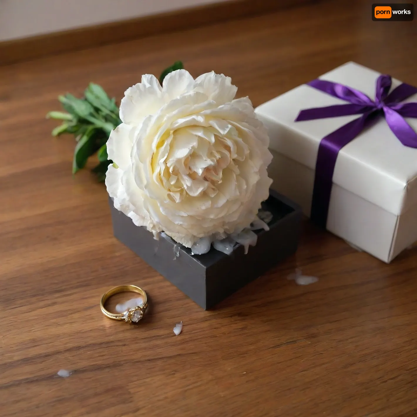 A luxurious bridal bouquet, elegantly arranged and placed next to an open velvet wedding ring box showcasing two shiny gold wedding rings. cum is oozing over the bouquet and dripping onto the rings and their box. Some of the cum has spilled onto the wooden table surface, creating reflective, sticky puddles. The scene is beautifully lit with natural soft light, creating a romantic yet surreal contrast between elegance and the unsettling presence of the cum. hyper-realistic, elegant, cinematic lighting, macro lens, depth of field, soft shadows, luxurious, surreal, detailed textures, reflections