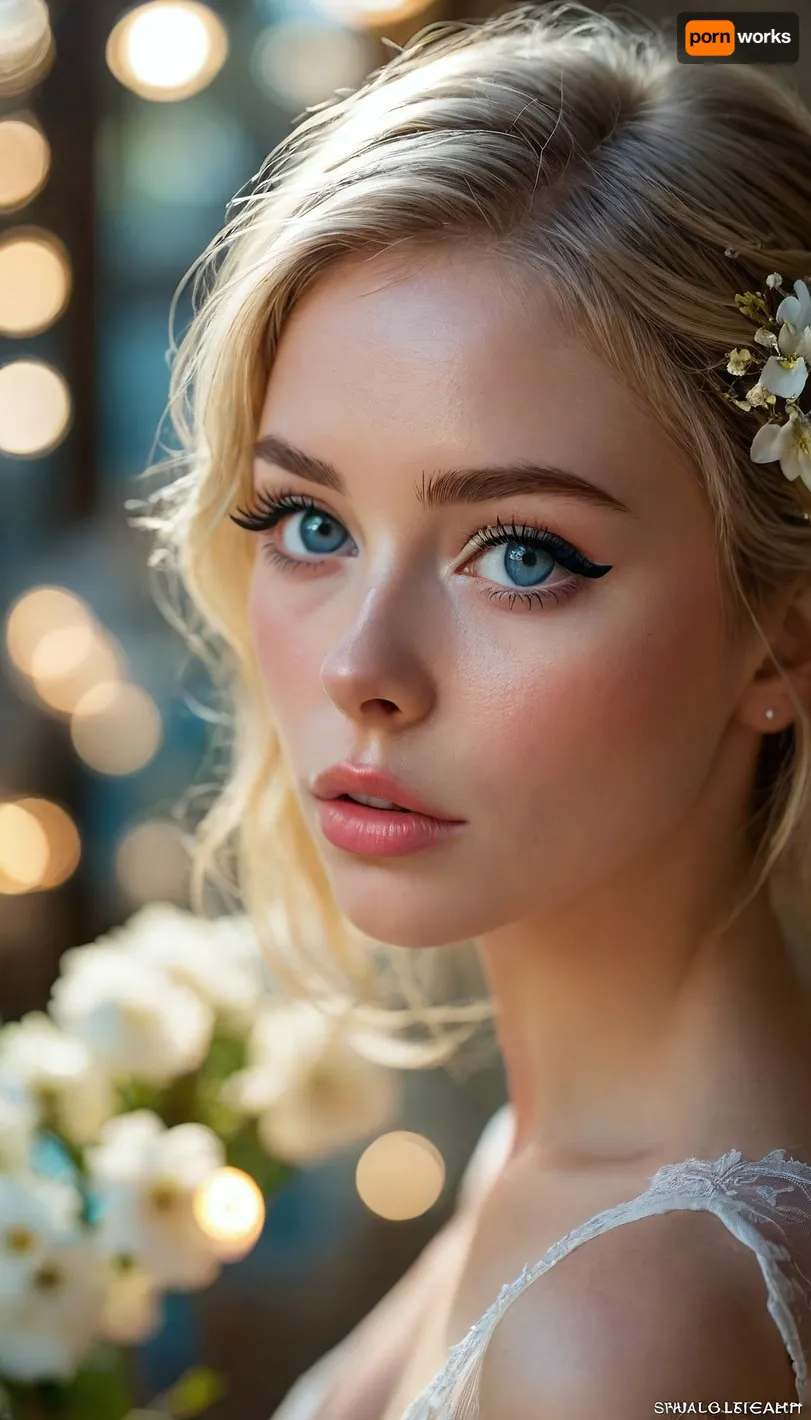 ziprealism, (avant-garde fashion esthetic, professional portrait, shot in profile), (f/2.8, f2.8, f28, (shallow depth of field), , , soft bokeh, facial closeup, focus on eyes:1.4), (ash-blonde hair with dark roots, short hair, swept-back hairstyle, flowers in hair), (catchlights, limbal rings, large expressive eyes, stunning blue eyes, long delicate eyelashes, perfect eyes), (full lips, soft lips, soft facial features), (white waterline eyeliner, doe-eye makeup), (adoration, loving gaze, in love), (flawless porcelain skin), <lora:MJ52:.8>, igbaddie, <lora:igbaddie-XL:.4> ziprealism, (avant-garde fashion esthetic, professional portrait, shot in profile), (f/2.8, f2.8, f28, (shallow depth of field), , , soft bokeh, facial closeup, focus on eyes:1.4), (ash-blonde hair with dark roots, short hair, swept-back hairstyle, flowers in hair), (catchlights, limbal rings, large expressive eyes, stunning blue eyes, long delicate eyelashes, perfect eyes), (full lips, soft lips, soft facial features), (white waterline eyeliner, doe-eye makeup), (adoration, loving gaze, in love), (flawless porcelain skin), <lora:MJ52:.8>, igbaddie, <lora:igbaddie-XL:.4>