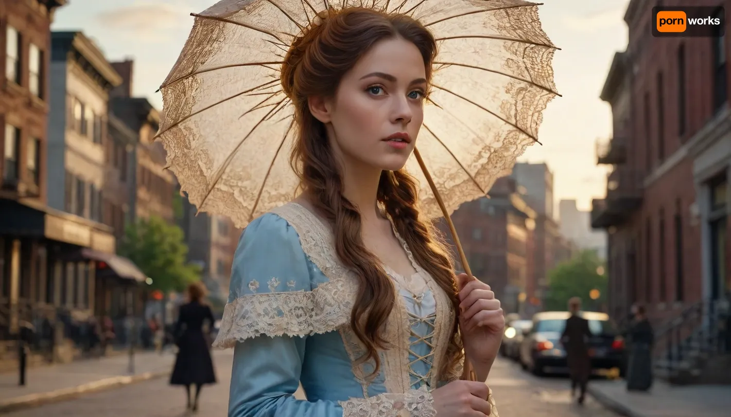 Cinematic, ultra-realistic, hyper-realistic, golden hour, 35mm, 19th-Century New York at sunset, bright day, billowing clouds. Beautiful woman dressed in Victorian lace, blue eyes, (holds a parasol), long brunette hair, (walking between buildings), woman looks at the city, thoughtful, (saturated, colors) Cinematic, ultra-realistic, hyper-realistic, golden hour, 35mm, 19th-Century New York at sunset, bright day, billowing clouds. Beautiful woman dressed in Victorian lace, blue eyes, (holds a parasol), long brunette hair, (walking between buildings), woman looks at the city, thoughtful, (saturated, colors)