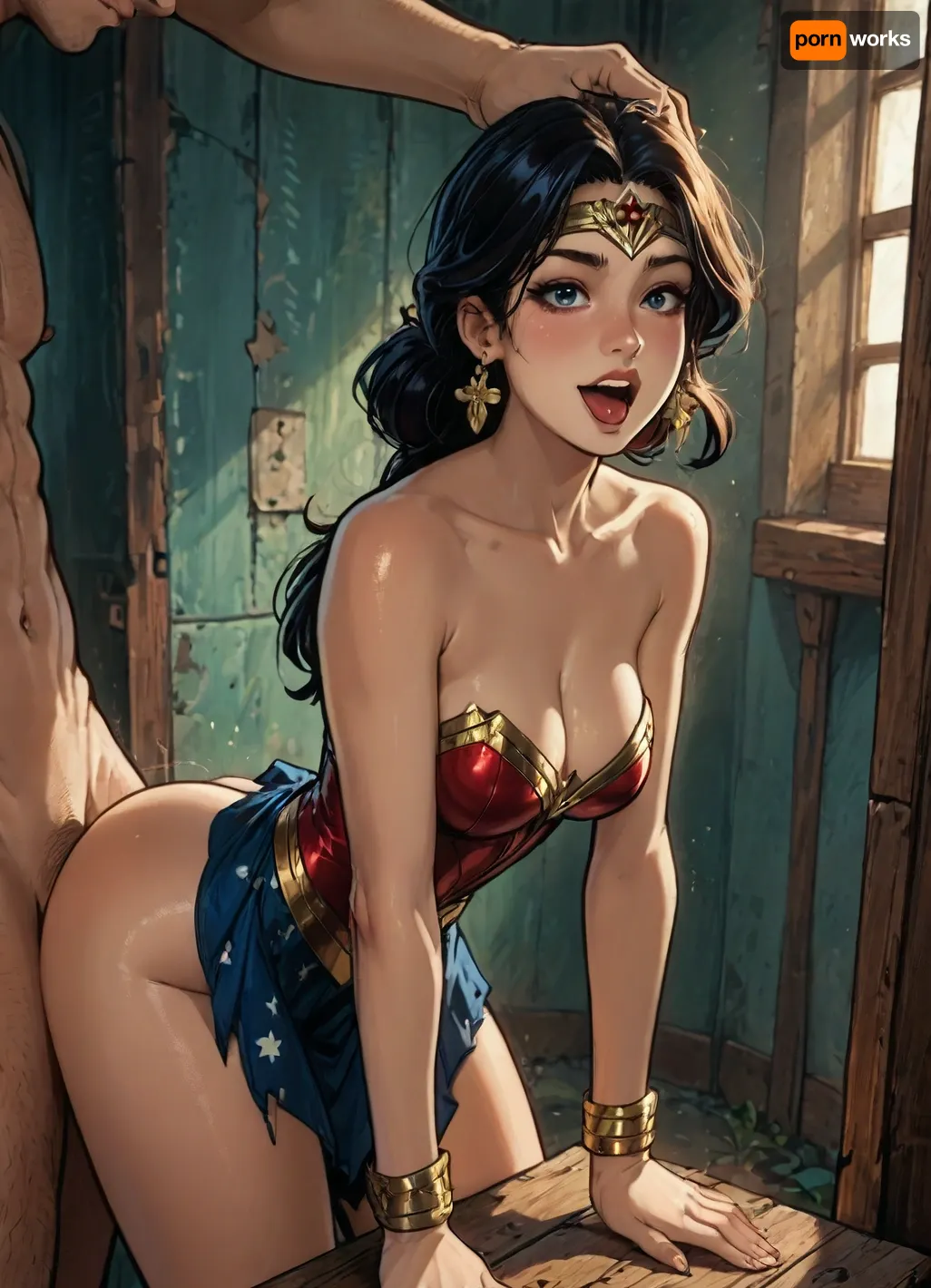 ((Reiq mix markgavatino and melkor mancin style)), wonder woman, doggystyle, fucked by behind, upper view, standing doggystyle, crazy happy, big ass, torn clothes, hair pulling, good lighting