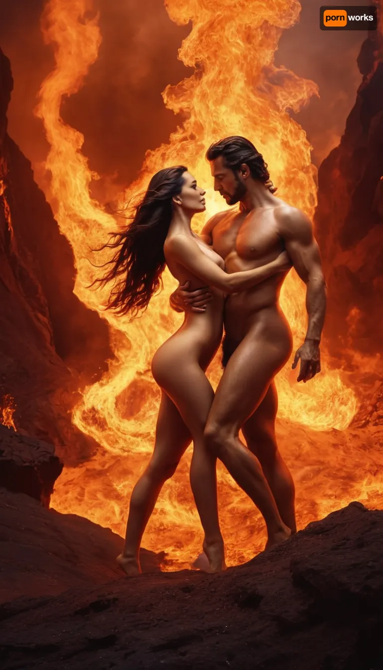 Cinematic, fantasy portrait in the style of Boris Vallejo, two blazing fire gods passionately dance the Tango, wisps of magical fire drape their naked bodies, they dance among blazing volcanos. Cinematic, fantasy portrait in the style of Boris Vallejo, two blazing fire gods passionately dance the Tango, wisps of magical fire drape their naked bodies, they dance among blazing volcanos.