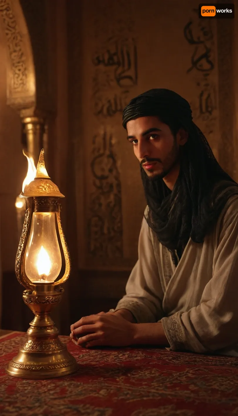 (arab prince prisoner in magical golden oil lamp in foreground), in background Scheherazade sensual princess from tales from the Arabian Nights watching it, arabian nights ambiance, arabic, calligraphy, dark, skin, <lora:arab_architecture_by_styx:1.5>, <lora:arabic_calligraphy:1.5>, <lora:Darker_skin_SDXL:.8>, <lora:Omani_male:.8>