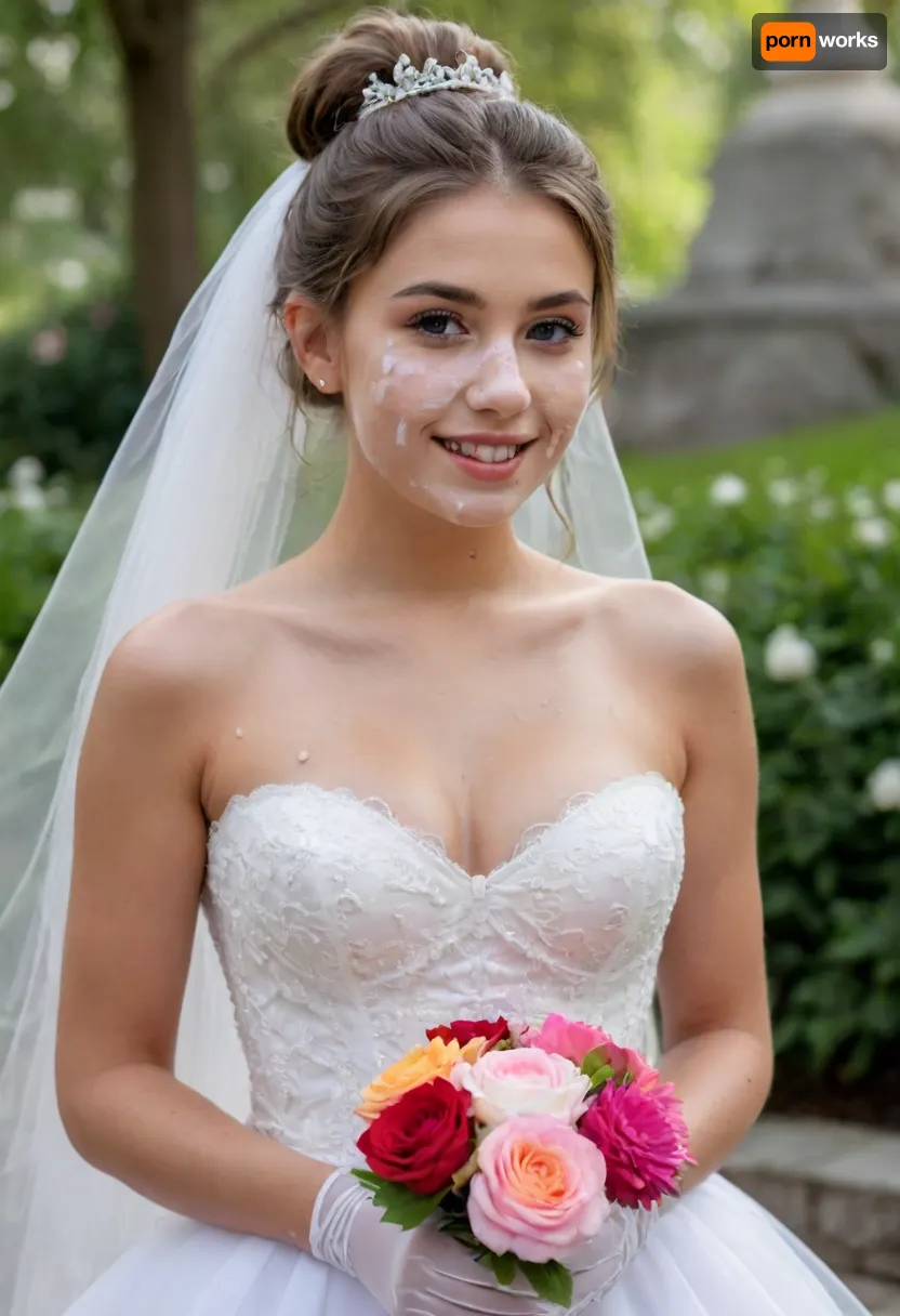 high resolution, high quality, young beautiful girl 18 years old, (3/4 length photo:1.7), (Hair up in elaborate bun:1.4), (((multiple loads of thick cum on her face:1.6))), (standing model posing, (wedding dress:1.2), (white corset:1.2), (wedding veil:1.3), (white lace gloves), very cute, smile, long wavy brunette hair, colorful flowers garden in the background), woman, cum, on, face, <lora:JustCum:1.6> high resolution, high quality, young beautiful girl 18 years old, (3/4 length photo:1.7), (Hair up in elaborate bun:1.4), (((multiple loads of thick cum on her face:1.6))), (standing model posing, (wedding dress:1.2), (white corset:1.2), (wedding veil:1.3), (white lace gloves), very cute, smile, long wavy brunette hair, colorful flowers garden in the background), woman, cum, on, face, <lora:JustCum:1.6>