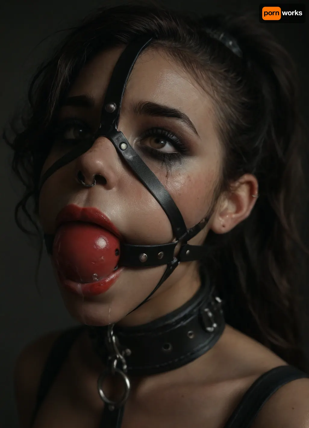 ((30 years old, Tipical italian girl, fit body, fake booobs, perfect cute face, scared, crying, curly very long brown hair in ponytail, brown eyes, light freckles, bimpo lips, skin pores, smooth skin, round ass, hips gap, oiled body)), ((heavy goth makeup, eyeshadow, eyeliner, mascara, red lipstick)), (slave collar), ((nose ring piercing, septum piercing:1.5)), (wearing a black thong), ((face harness gagged mouth:1.5)), ((drooling saliva from mouth, lot of saliva)), in a country apartment, harnessgag, ballgag, <lora:add-detail-xl:1.3>, <lora:detailed_notrigger:1.2>, <lora:dark:.8>, <lora:harnessgag_xl-000003:1.3>, <lora:sdxl_ballgags:1.1> ((30 years old, Tipical italian girl, fit body, fake booobs, perfect cute face, scared, crying, curly very long brown hair in ponytail, brown eyes, light freckles, bimpo lips, skin pores, smooth skin, round ass, hips gap, oiled body)), ((heavy goth makeup, eyeshadow, eyeliner, mascara, red lipstick)), (slave collar), ((nose ring piercing, septum piercing:1.5)), (wearing a black thong), ((face harness gagged mouth:1.5)), ((drooling saliva from mouth, lot of saliva)), in a country apartment, harnessgag, ballgag, <lora:add-detail-xl:1.3>, <lora:detailed_notrigger:1.2>, <lora:dark:.8>, <lora:harnessgag_xl-000003:1.3>, <lora:sdxl_ballgags:1.1>