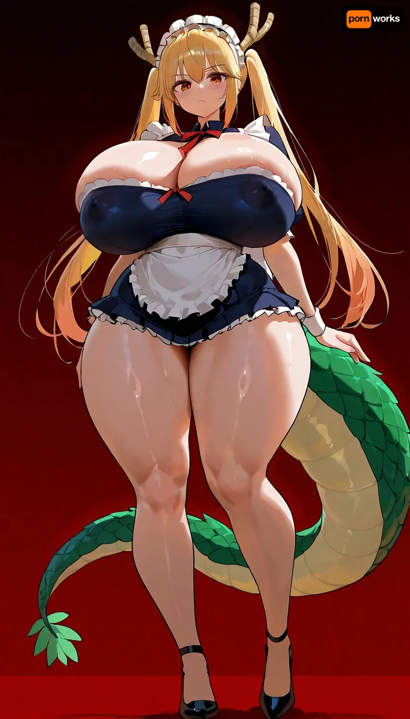 Tohru dragon maid. Venus body, hyper boobs, huge cleavage, maid outfit, tight clothes, covered nipples, large areolas, green dragon tail. Full body view., nicorima, flat, chest, gigantic, small, hips, thighs, wide, thick, plump, belly, muscular, female, arms, extra, abs, large, breasts, big, boobs, huge, tits, <lora:Nicorima Style:.8>, <lora:Venus_Body_Alpha:.8>, <lora:bombshell_v2:.8>