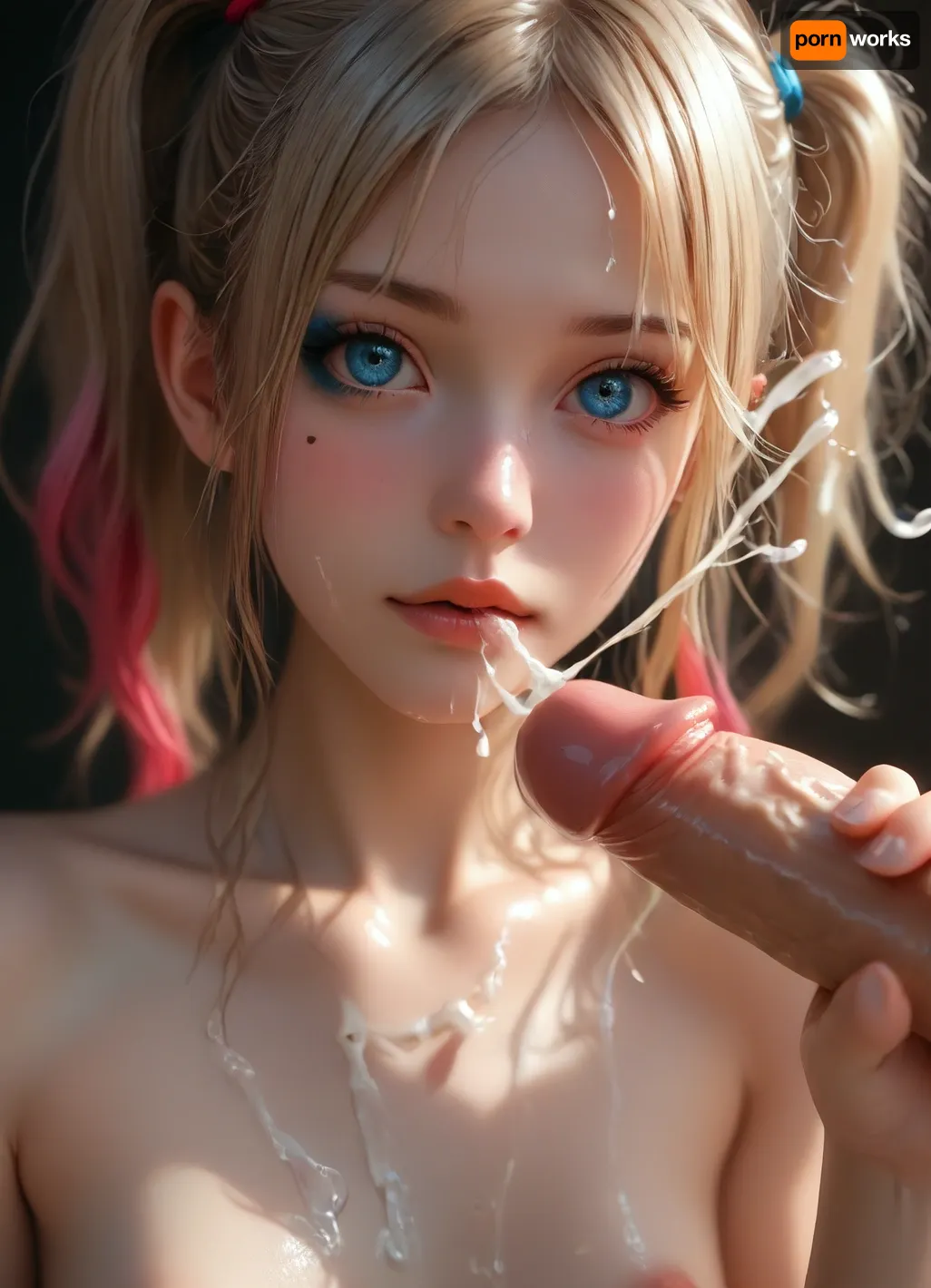 4k, ((Harley Quinn)), man in front of girl, white cock, erection, handjob, milking huge cumshot from huge black cock, excessive semen on face, (cumshot:1.4), excessive semen dripping from penis, semen, on, face, Dynamic view, dynamic pose, realistic XHyperreal Max Quality High detail, oriental temple, (Skinny, slim, ultra slim naked body:1.2), (tiny breasts:1.2), naked, young, sweet, cute, gorgeous Highlights, yui ohtsuki, ultra flirty, sexiest cutie, abigail williams from Fate, lillie from Pokemon, seductive facial expression, narrow hips, bangs, (messy hair in a ponytail), tempting, sexy, blue eyes, seductively satisfied, exhausted, aroused face, perfect lips, tanned, soft skin, puffy nipples, very sweaty skin, black background, black room, nudity, SDXL_BetterFaces-LoRA_v1, .5>, (music_), <lora:Oxygen girl_SDXL1.0:1>, <lora:MJ52:.7>, <lora:BUT_SDXL_SHS:.1>, 1girl, blonde, scary, <lora:Halloween Series_ Harley Quinn_epoch_10:.8>