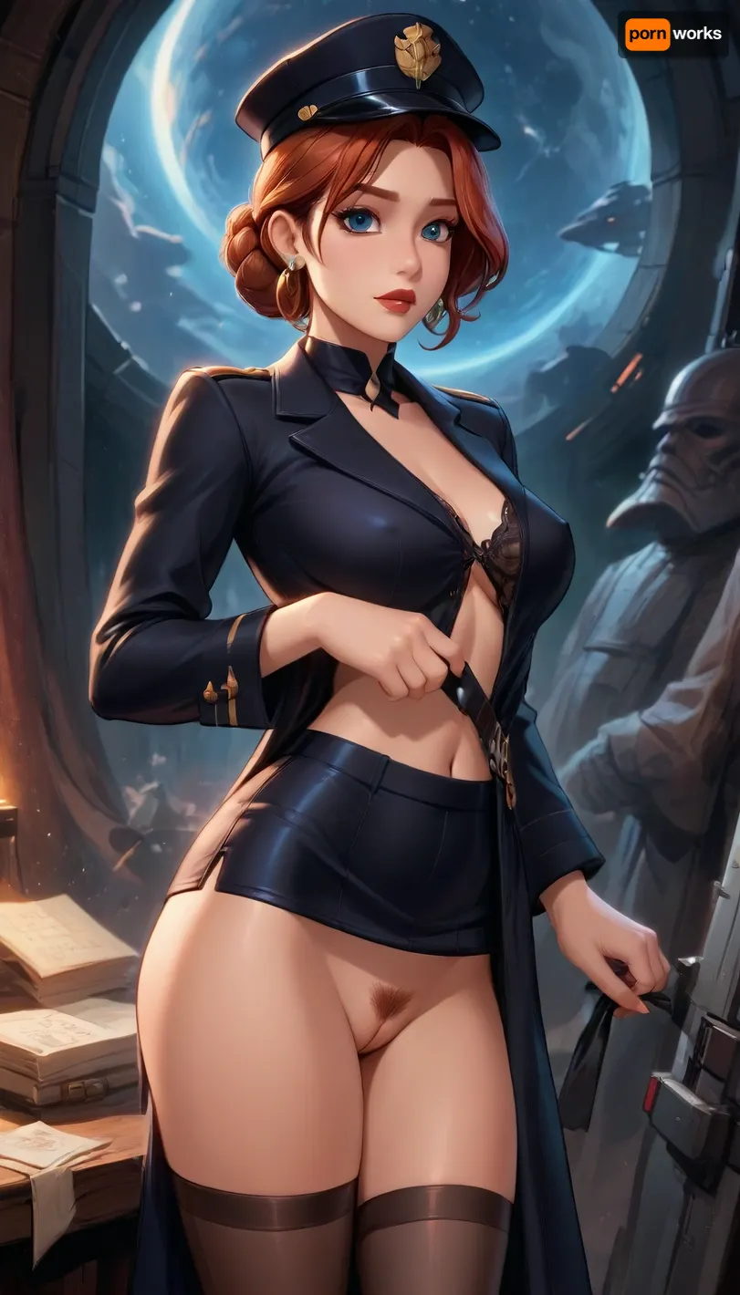 Reiq style, 45 years old milf lady, Very attractive, short slicked hairstyle, (black uniform imperial officer from star wars, with hat), hard nipples under uniform, short skirt, nude genitals, visible pussy with pubic hair, dark spaceship background, <lora:add-detail-xl:2>, <lora:princess_xl_v2:.8>, <lora:DetailedEyes_V3:2>, <lora:Animated_Concept:.9> Reiq style, 45 years old milf lady, Very attractive, short slicked hairstyle, (black uniform imperial officer from star wars, with hat), hard nipples under uniform, short skirt, nude genitals, visible pussy with pubic hair, dark spaceship background, <lora:add-detail-xl:2>, <lora:princess_xl_v2:.8>, <lora:DetailedEyes_V3:2>, <lora:Animated_Concept:.9>