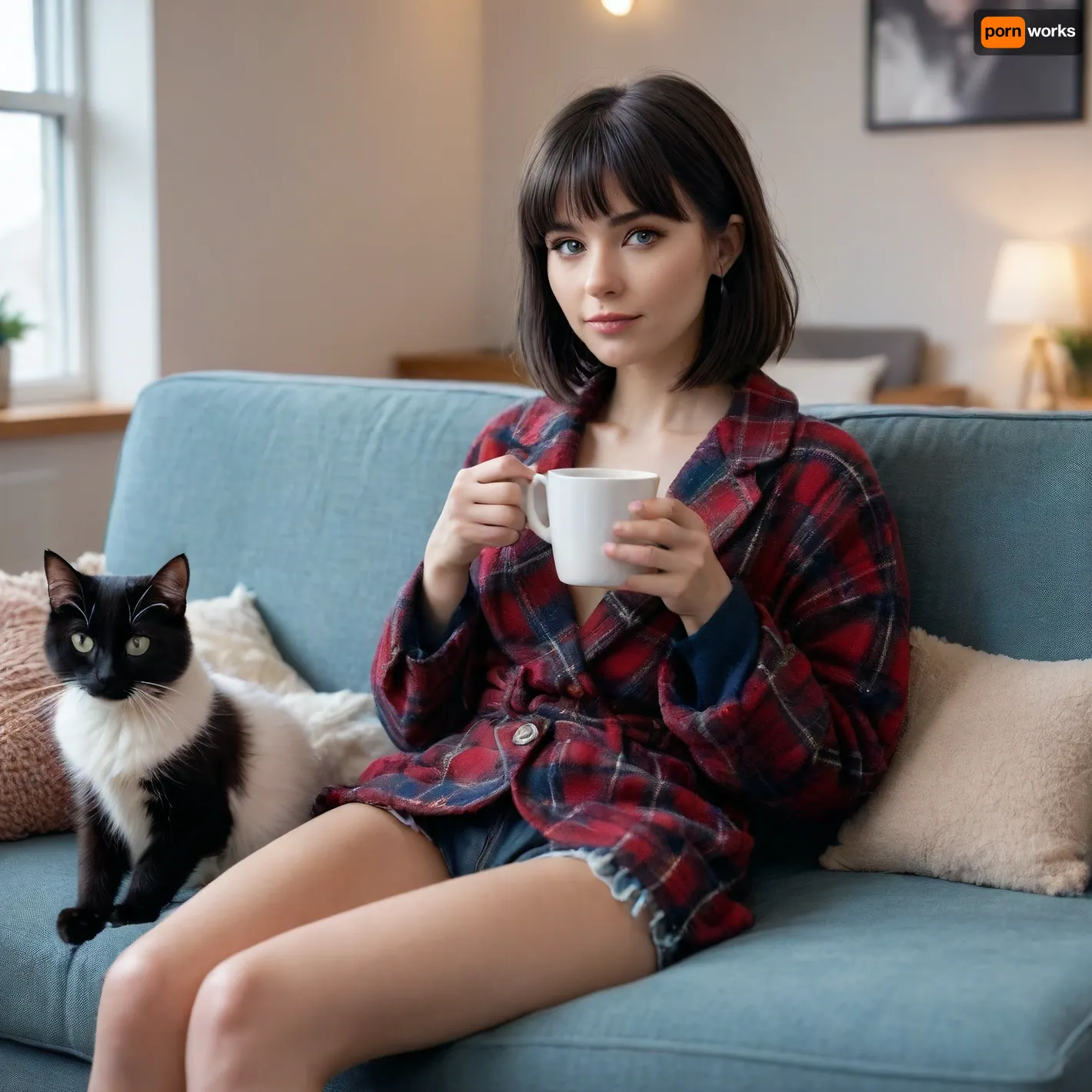 full-length panorama on the lower level of the foreground, wrapped in a plaid plaid, she sits on the couch next to a fluffy kitten and drinks coffee, front view, cozy bedroom, black bob haircut, straight bangs and blue eyes, tanned cutie full-length panorama on the lower level of the foreground, wrapped in a plaid plaid, she sits on the couch next to a fluffy kitten and drinks coffee, front view, cozy bedroom, black bob haircut, straight bangs and blue eyes, tanned cutie