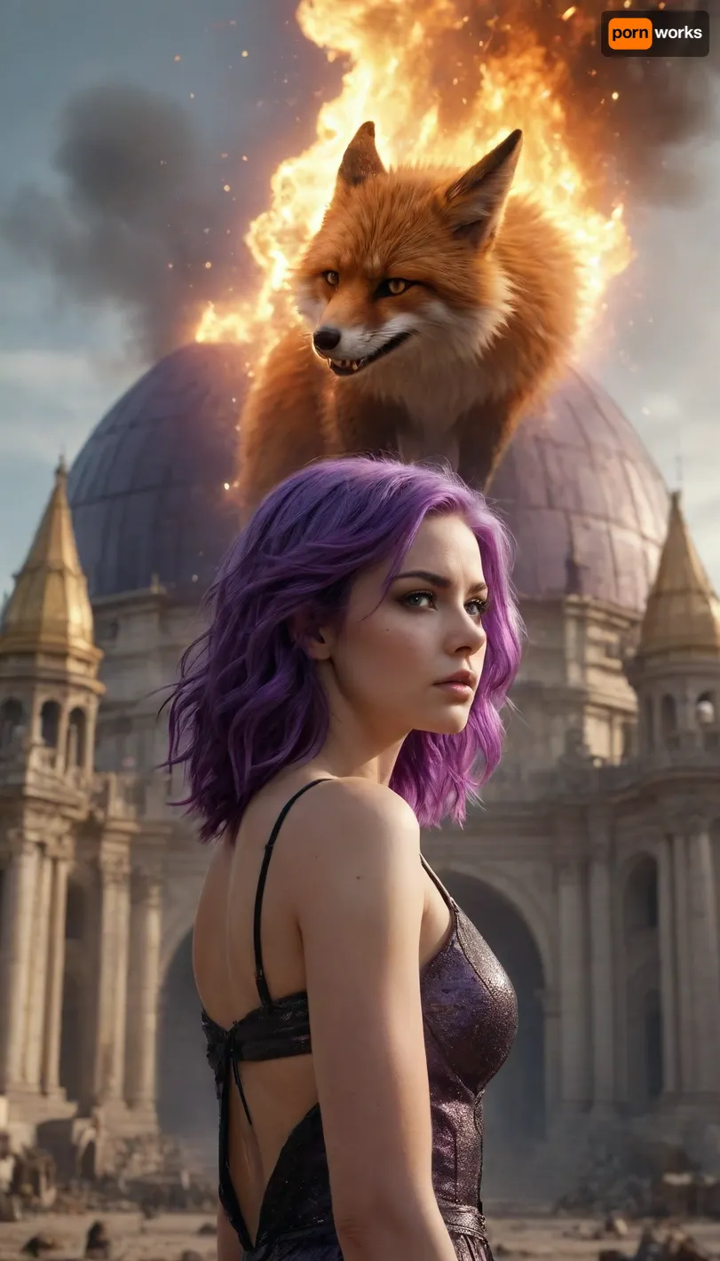 A young woman with vibrant purple hair gently embraces a tender fox, surrounded by golden butterflies and translucent, floating jellyfish in a serene, magical dome filled with soft, ethereal light. The camera slowly pulls back, revealing a stark contrast between the peaceful dome and the apocalyptic wasteland outside, where raging flames and rubble dominate the landscape. Behind the dome, a towering fire demon alternates between casting fiery magic and launching physical strikes against the protective barrier, each impact triggering lightning bolts that surge from the dome to strike the demon, creating bursts of sparks and smoke., [Truck right, Pan left, Tracking shot] A young woman with vibrant purple hair gently embraces a tender fox, surrounded by golden butterflies and translucent, floating jellyfish in a serene, magical dome filled with soft, ethereal light. The camera slowly pulls back, revealing a stark contrast between the peaceful dome and the apocalyptic wasteland outside, where raging flames and rubble dominate the landscape. Behind the dome, a towering fire demon alternates between casting fiery magic and launching physical strikes against the protective barrier, each impact triggering lightning bolts that surge from the dome to strike the demon, creating bursts of sparks and smoke., [Truck right, Pan left, Tracking shot]