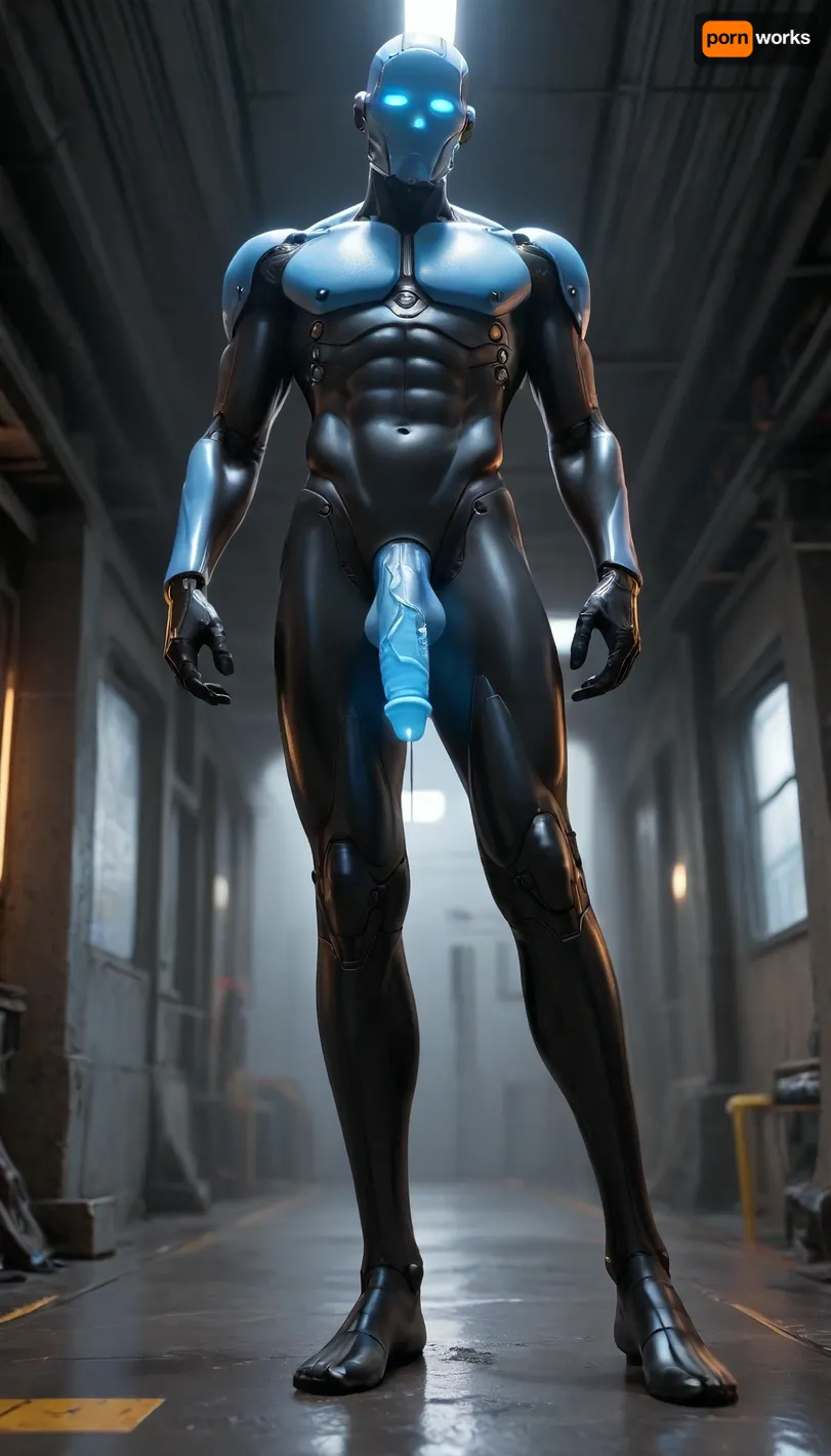 a male robot, robot, not human, dark black and blue plastic body, with a electric blue translucent penis, curved down, flaccid, soft, veiny, dripping blue luminous electric cum, standing, with legs spread wide open, seen from side below, full body image. robot is very tall, imposing, strong, not bulky, athletic, lean but not skinny, 10 feet tall. aggressive and provocative look, menacing. In a futuristic space ship. a male robot, robot, not human, dark black and blue plastic body, with a electric blue translucent penis, curved down, flaccid, soft, veiny, dripping blue luminous electric cum, standing, with legs spread wide open, seen from side below, full body image. robot is very tall, imposing, strong, not bulky, athletic, lean but not skinny, 10 feet tall. aggressive and provocative look, menacing. In a futuristic space ship.
