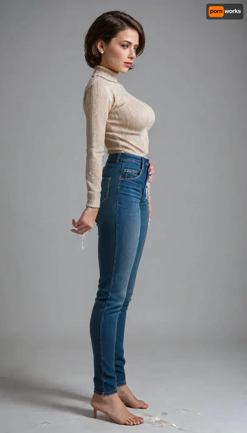helen parr, large breasts, detailed waist, beautiful face, jeans, tan sweater, full body, side view, covered in cum, lots on cum