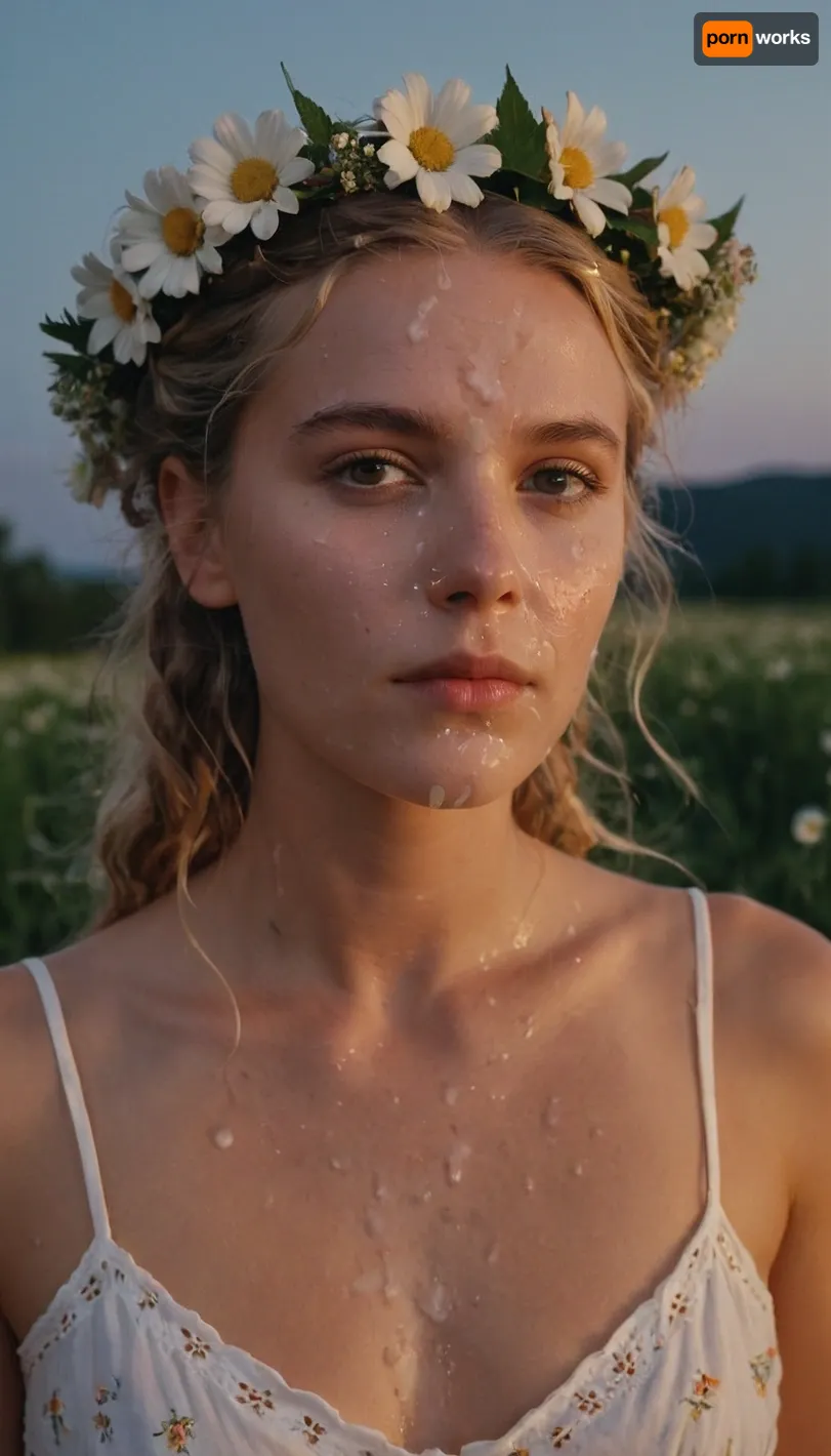 half body portrait of a young woman, swedish, flatchested, wearing a summerdress, flower wreath in hair, during white night, midsommar, (cum on face, thick white cum:1.2), . woman, cum, on, face, <lora:JustCum:1.1>