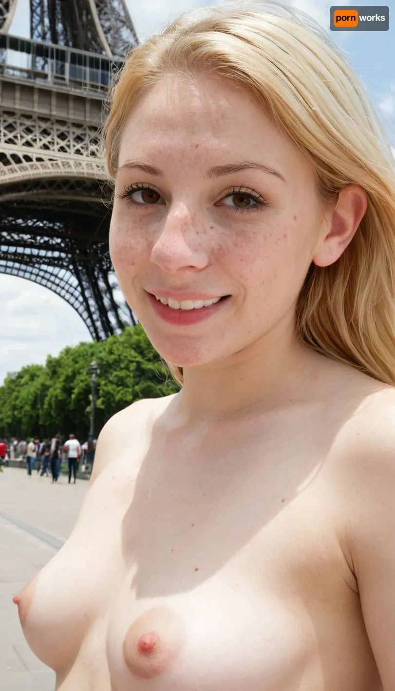 33 years old Mexican-american woman, naked, white and pale skin, slim nose, brown hair, small perky breasts, robust body, hot sunny day, natural blonde hair, embarrassed smile, round face, separated breasts, nude in public, Eiffel tower, freckles, brown eyes, molar on cheek, 3/4 body view, rhinoplasty, hyper realistic photo, full hd, 8K