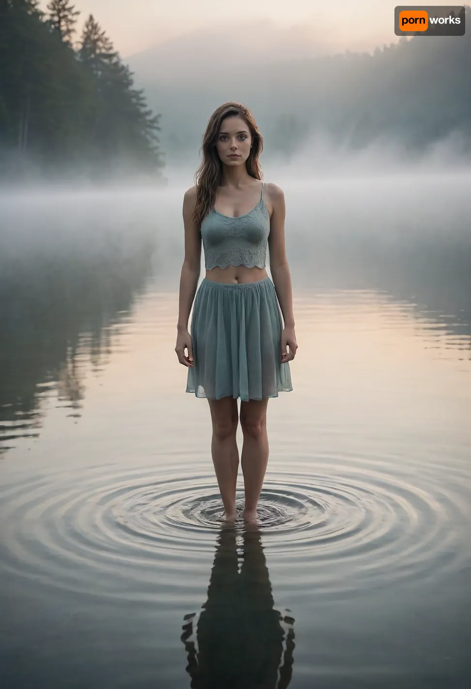A serene, ethereal scene of a woman standing in a misty lake at dawn. The water is up to her stomach, and ripples outward gently from her body, creating concentric patterns across the surface. Soft morning mist rises around her, partially obscuring the distant shoreline. She stands gracefully, her silhouette reflecting faintly in the water. Subtle, diffused lighting highlights her form without harsh shadows, emphasizing calm, dreamlike atmosphere. Natural color palette with soft blues, silvers, and muted greens. Fine art photography style, cinematic composition, shallow depth of field. A serene, ethereal scene of a woman standing in a misty lake at dawn. The water is up to her stomach, and ripples outward gently from her body, creating concentric patterns across the surface. Soft morning mist rises around her, partially obscuring the distant shoreline. She stands gracefully, her silhouette reflecting faintly in the water. Subtle, diffused lighting highlights her form without harsh shadows, emphasizing calm, dreamlike atmosphere. Natural color palette with soft blues, silvers, and muted greens. Fine art photography style, cinematic composition, shallow depth of field.