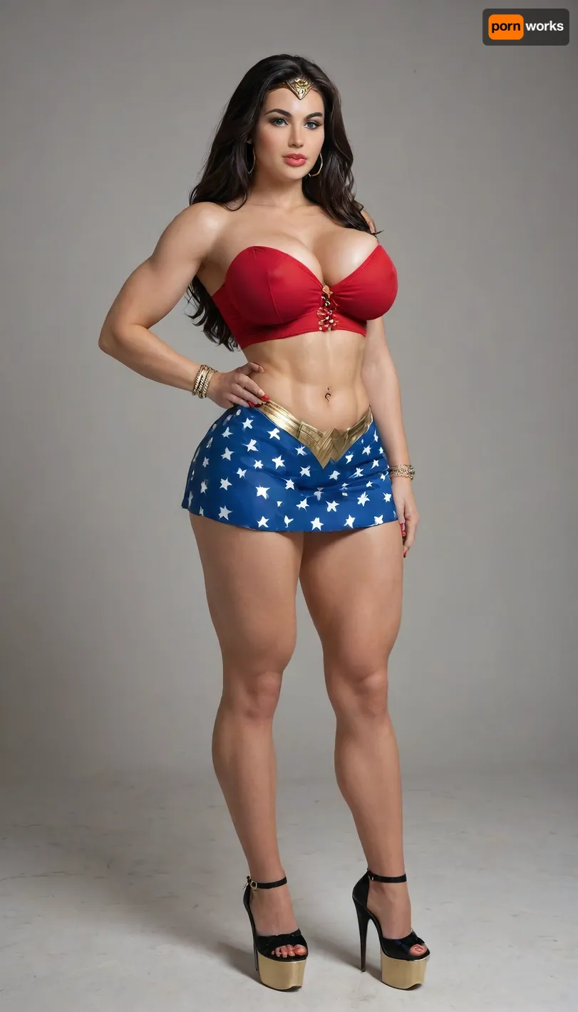 Basement, super-hero hideout, wonder-woman uniform, wonder-woman corset, wonder-woman crop-top, wonder-woman skirt, wonder-woman tiara, high platform heels, bracelets, navel piercing, bimbo, wedding ring, long red fingernails, blue eyes, red filled lips, thick bimbo lips, brunette, big tits big ass, muscular abs, hoops, hard nipples, long straight hair with bangs, bmbplora, <lora:bimboxl_02:.8>, large, boobs, tits, <lora:bombshell_v2:.8>, ass, narrow, waist, <lora:BodyLicious:.8>, flat, chest, big, breasts, huge, gigantic, small, hips, thighs, wide, thick, plump, belly, muscular, female, arms, extra, abs, <lora:Venus_Body_Alpha:.8>
