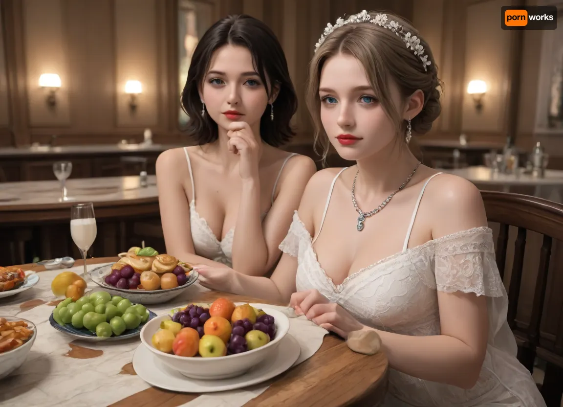 The image depicts a lavishly set dining table, laden with food and beverages for a festive occasion. There are platters filled with fish, a baked meat dish, and a variety of wines and spirits. Beautifully prepared desserts, as well as bowls of grapes, pears, and other fruits, are displayed. Elegant glassware and dinnerware surround the dishes. Floral arrangements serve as centerpieces, adding to the opulent atmosphere. Today was my birthday, and I decided to celebrate it in a special way. I put on green eye shadow and bright lipstick. My sister also decided to join me in this unusual celebration. Together, my sister and I filmed in the nude. We have milk running down our thighs, and we only wear stockings. I put the words "boob" on my sister's boobs with lipstick. My sister also did not stay away and painted hearts all over her body with lipstick. But that wasn't all. I decided to go even further and entered the sauna with a bottle of lipstick in my hands. I put lipstick on my lips and started masturbating in hot water. My sister did the same thing. My sister and I were both sitting on chairs, holding our feet in the air, and applying nail polish to the skin of our feet. I could feel my vagina filling with moisture, and I applied green shadows to its edges. Our birthday was unusual and funny, but we enjoyed every moment. We had naked and attractive breasts with expressive nipples painted in a deep purple color. This day will always remain in our memory.