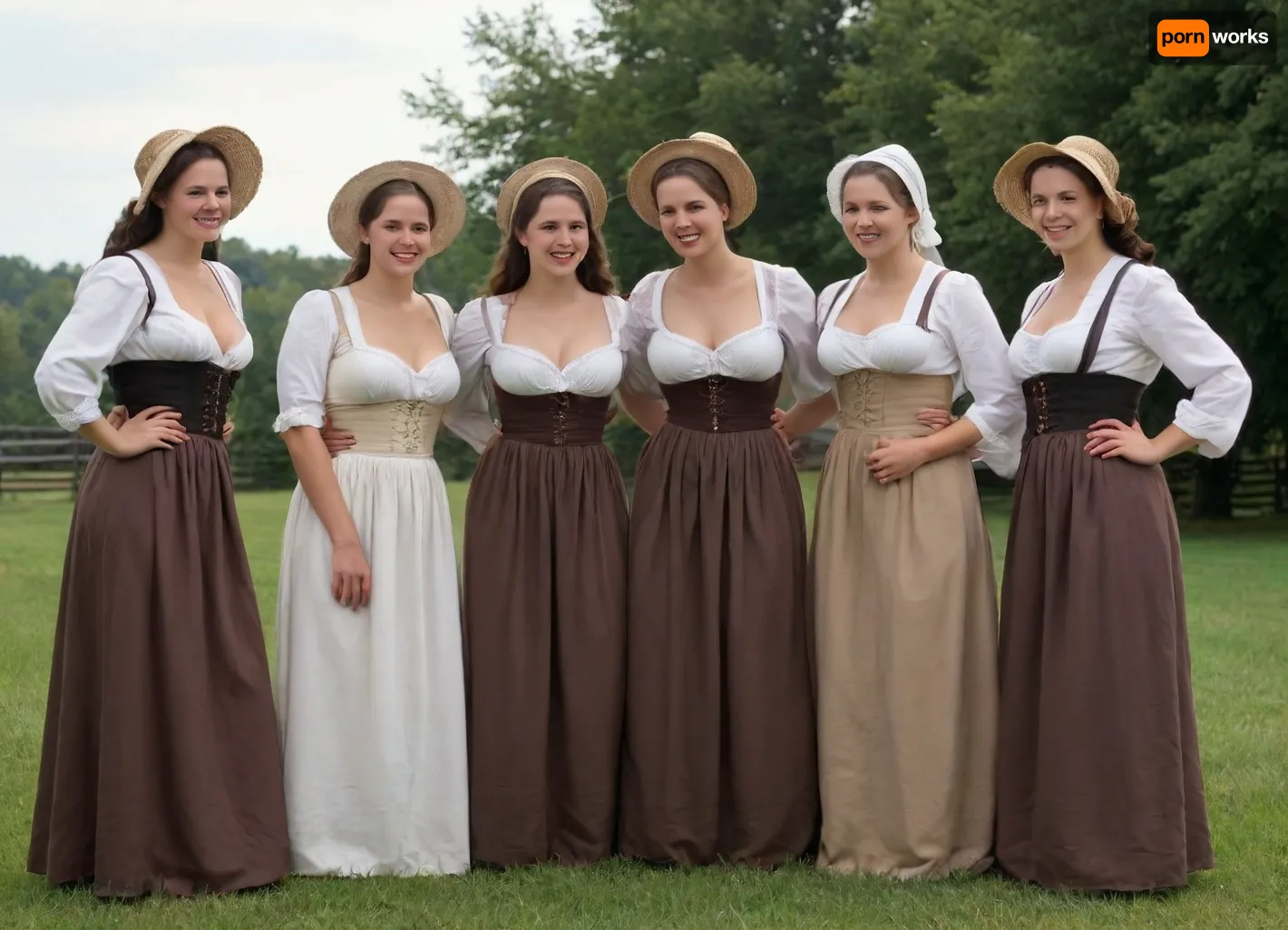 Group of ten lesbian half-naked beautiful Amish busty women, 25 years old, traditional Amish dress with bonnet, long skirt, unbuttoned corsette, fully exposed naked breasts, topless, no bra, showing naked breasts to each other, touching breasts of each other, beautiful breasts, nice tits, strong legs, smiling, farm outdoor, hyperrealistic