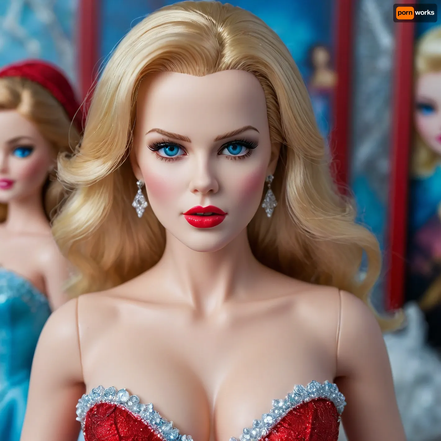 beautiful, Nicole Kidman face, sexy, barbie doll, doll joints, plastic, full body portrait, slutty, high heels, big lips, red lipstick, giant boobs, bimbo, elsa frozen