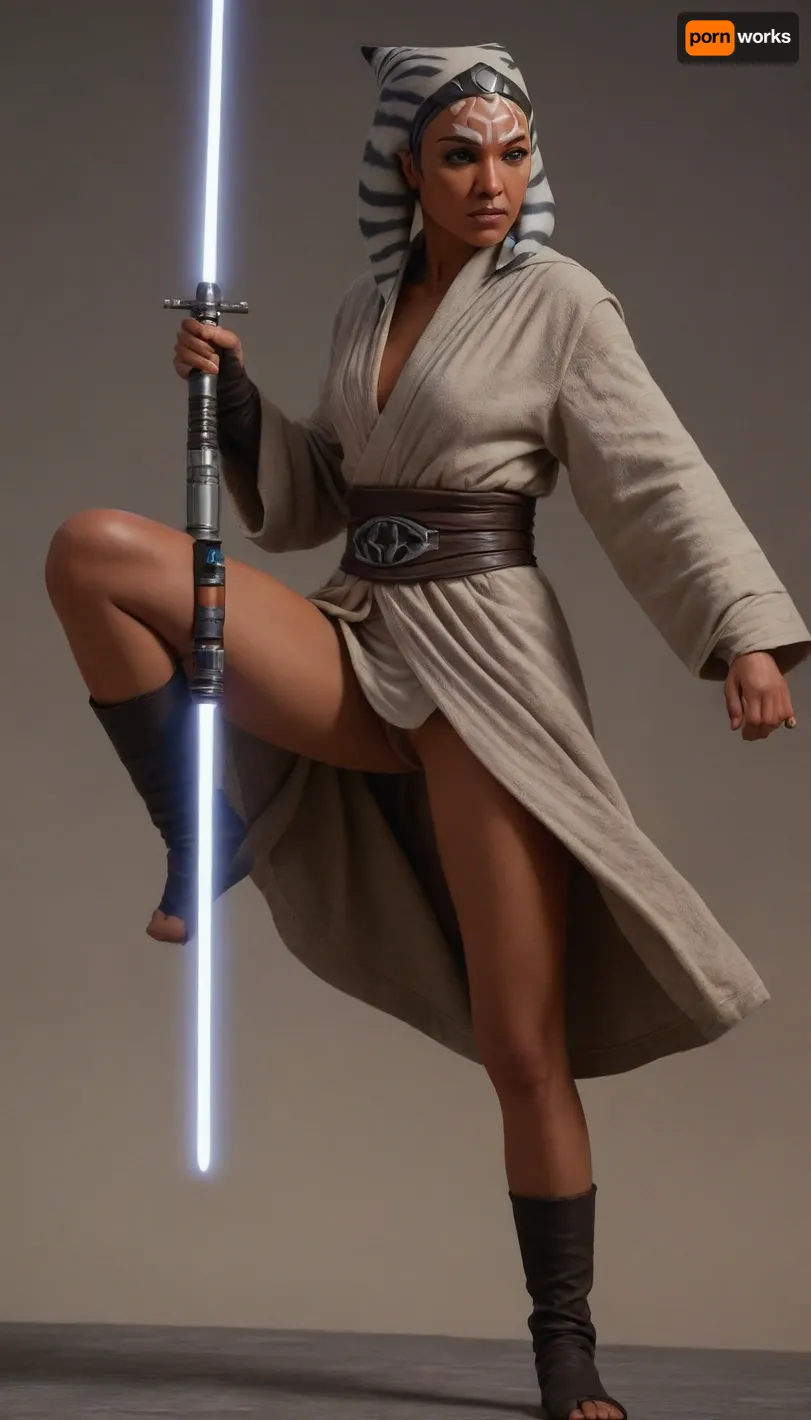 In a dramatic and >Star Wars inspired setting, (full body front view from below:1.4), of a sexy Ahsoka Tano with perfect anatomy, aged 25, (executes a flawless head kick:1.4), (with perfect form and posture:1.5), reminiscent of a master martial artist. She stands in a powerful, dynamic pose, (her leg extended high in the kick:1.3), her upper body bent forward in a fighting stance, In one hand, (she grips a light saber:1.1), ready to continue the fight after the kick, (Her attire includes the traditional robe of Jedi made of finely woven cotton fabric:1.5), layered and flowing with natural folds. The toga is simple yet elegant, in muted earth tones, designed for freedom of movement. A wide brown leather belt wraps around the waist, worn and practical, holding the robe in places, and a flowing short wool tunic that lifts with the movement, exposes a well lit, (perfect pussy:1.6), The scene is well illuminated by bright sunlight, while darker, dramatic clouds loom in the sky, adding intensity. Every detail is captured in high resolution, the texture of her skin, the sheen of sweat, the movement of her hair, and the fabric of her tunic. A hint of smoke in the air and the overall atmosphere reflect the life-and-death stakes of the battle, ultra-sharp details, realistic skin texture, refined contrast, 8k detail, authentic facial expression, clean composition, (maximum photo quality:1.4), (maximum resolution:1.5), Ahsoka, Tano, ahsoka, tano, <lora:Ahsoka_Tano_XL:.9>