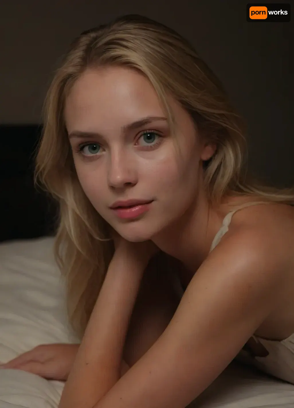 Full-body of a 25-year-old girl, bags and wrinkles are visible, (grainy skin:2), (Dim light), (blond hair with a side parting:1.7), blue eyes, subtle eyeliner and a natural lipstick, casual and relaxed pose, realistic style, (girl has a slim figure), natural look, (simple and elegant), woman's hair is slightly wavy, woman has a confident expression, relaxed mood, (subtle makeup), subtle smile. woman laying on stomach, <lora:woman_laying_on_stomach_xl_lora_reg-000027:1.2>