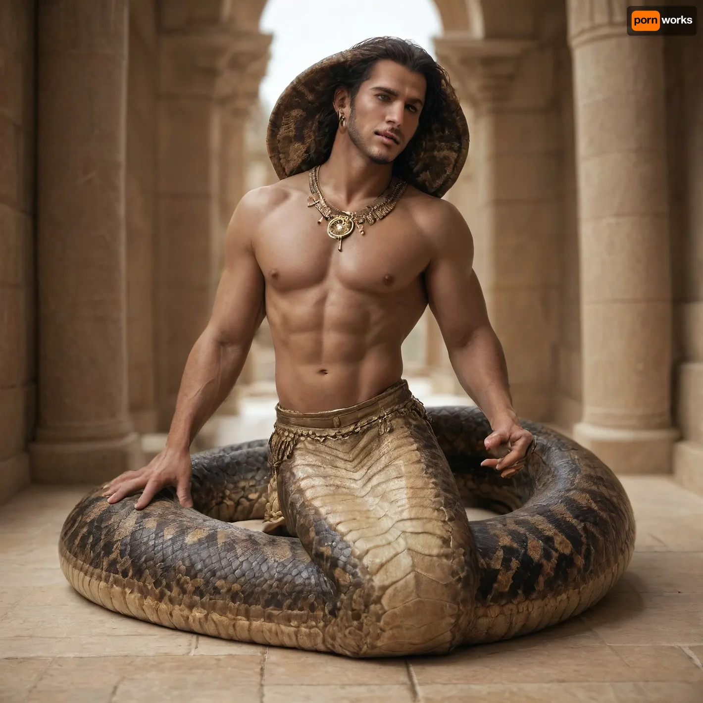 Snake man. Naga. Half snake half human. Attractive. Monster. Lamia. Male. Man. Egyptian. Scales. Snake fangs. Snake skin. Hybrid. Snake tail from the waist down. No legs. Full body. Scales on chest. Long tail. Arms. Dark skin. Jewelry. Solo male. Cobra fins. Half snake. Clawed hands. Naga. Attractive monster. Seductive monster. Claws. Fangs. Monster